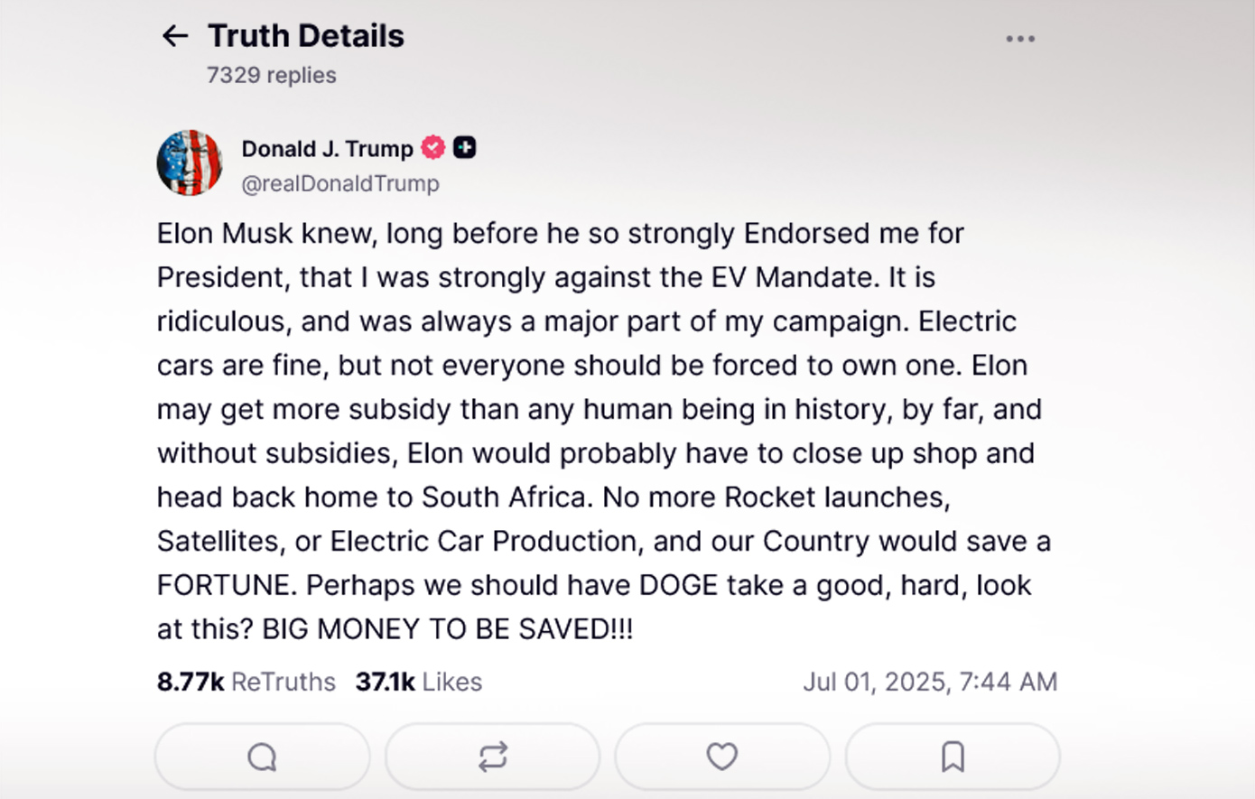 «Ο Έλον Μασκ γνώριζε, πολύ πριν με υποστηρίξει για Πρόεδρο, ότι ήμουν σθεναρά αντίθετος στα EV. Είναι γελοίο και αποτελούσε πάντα σημαντικό μέρος της προεκλογικής μου εκστρατείας. Τα ηλεκτρικά αυτοκίνητα είναι μια χαρά, αλλά δεν πρέπει να υποχρεώνονται όλοι να έχουν ένα. Ο Έλον μπορεί να παίρνει τις περισσότερες επιδοτήσεις από οποιονδήποτε άνθρωπο στην ιστορία, μακράν, και χωρίς επιδοτήσεις, ο Έλον πιθανότατα θα έπρεπε να κλείσει το μαγαζί και να επιστρέψει στη Νότια Αφρική. Τέρμα οι εκτοξεύσεις πυραύλων, οι δορυφόροι ή η παραγωγή ηλεκτρικών αυτοκινήτων, και η χώρα μας θα εξοικονομούσε ένα ΤΕΡΑΣΤΙΟ ΠΟΣΟ. Ίσως θα έπρεπε να βάλουμε την DOGE να ρίξει μια καλή, σκληρή ματιά σε αυτό; ΠΟΛΛΑ ΧΡΉΜΑΤΑ ΘΑ ΕΞΟΙΚΟΝΟΜΗΘΟΎΝ!!!», έγραψε στο Truth Social με την ανάρτηση να γίνεται viral.