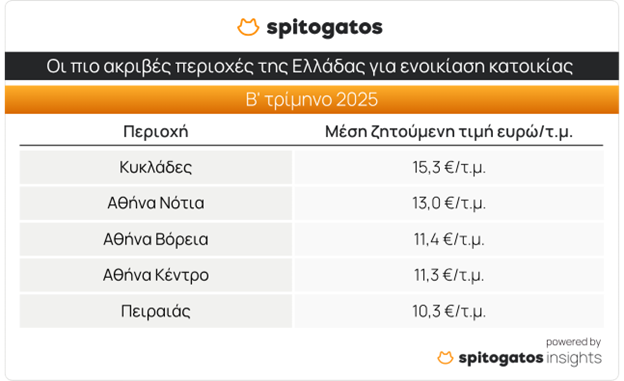 Ακολουθούν οι Κυκλάδες, τα Βόρεια Προάστια, η Λευκάδα και τα Χανιά, περιοχές που συγκεντρώνουν αυξημένη ζήτηση από Έλληνες και ξένους επενδυτές. Αναφορικά με την ενοικίαση, η Μύκονος, η Σαντορίνη και γενικότερα τα νησιά των Κυκλάδων καταγράφουν τις υψηλότερες τιμές στην Ελλάδα, με ΜΖΤ στα 15,3 ευρώ/τ.μ., ακολουθούμενες από τα Νότια (13,0 ευρώ/τ.μ.) και Βόρεια Προάστια (11,4 ευρώ/τ.μ.).