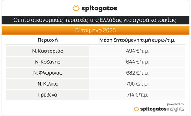 Στην άλλη άκρη της κλίμακας, οι πιο προσιτές τιμές πώλησης εντοπίζονται στη Δυτική Μακεδονία, με την Καστοριά, την Κοζάνη, τη Φλώρινα, το Κιλκίς και τα Γρεβενά να προσφέρουν τις χαμηλότερες ΜΖΤ στην ελληνική αγορά.