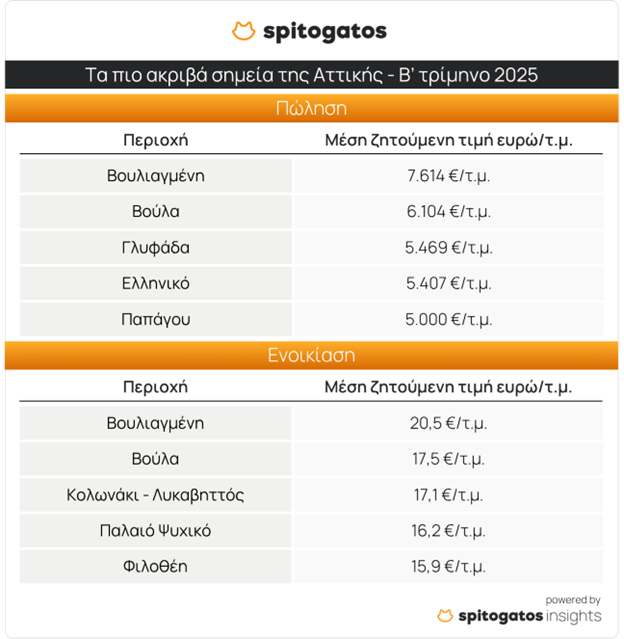 Στην Αττική, η Βουλιαγμένη και η Βούλα διατηρούν τη θέση τους ως οι πιο ακριβές περιοχές για αγορά και ενοικίαση κατοικίας. Ακολουθούν η Γλυφάδα, το Ελληνικό και ο Παπάγος. Αντίστοιχα, στην ενοικίαση, κορυφαίες σε τιμές περιοχές παραμένουν το Κολωνάκι, το Παλαιό Ψυχικό και η Φιλοθέη.