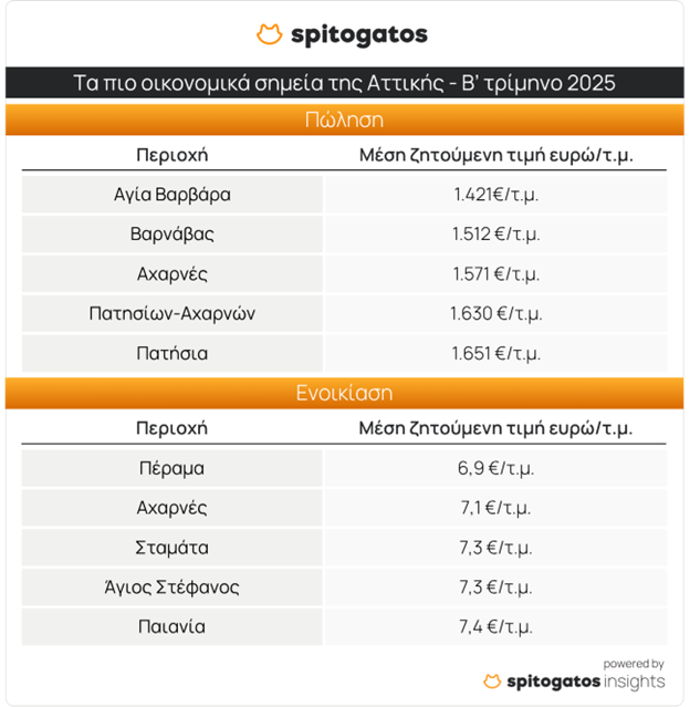 Από την άλλη, περιοχές όπως η Αγία Βαρβάρα, ο Βαρνάβας, οι Αχαρνές, τα Πατήσια και το κέντρο της Αθήνας εξακολουθούν να προσφέρουν πιο προσιτές επιλογές, με ΜΖΤ πώλησης έως 1.571 ευρώ/τ.μ.. Στις ενοικιάσεις, φθηνότερες περιοχές είναι το Πέραμα, οι Αχαρνές, η Σταμάτα και η Παιανία, με ενοίκια κάτω από 7 ευρώ/τ.μ.
