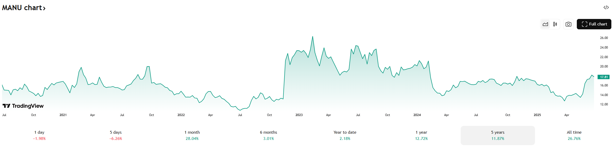 Η Manchester United καταβάλλει τακτικά μερίσματα από το 2015, γεγονός που την καθιστά ιδιαίτερα ελκυστική για όσους επιδιώκουν σταθερά εισοδήματα. Ωστόσο, η μετοχή της παραμένει ευαίσθητη στις αθλητικές επιδόσεις και στο γενικότερο κλίμα της αγοράς, γεγονός που οδηγεί σε σημαντικές διακυμάνσεις. Ενδεικτικά, η πορεία της στο UEFA Europa League το πρώτο τρίμηνο του 2025 οδήγησε σε αύξηση πωλήσεων κατά 17,4% και προκάλεσε άνοδο της μετοχής, παρά τις απογοητευτικές εμφανίσεις στο εγχώριο πρωτάθλημα.