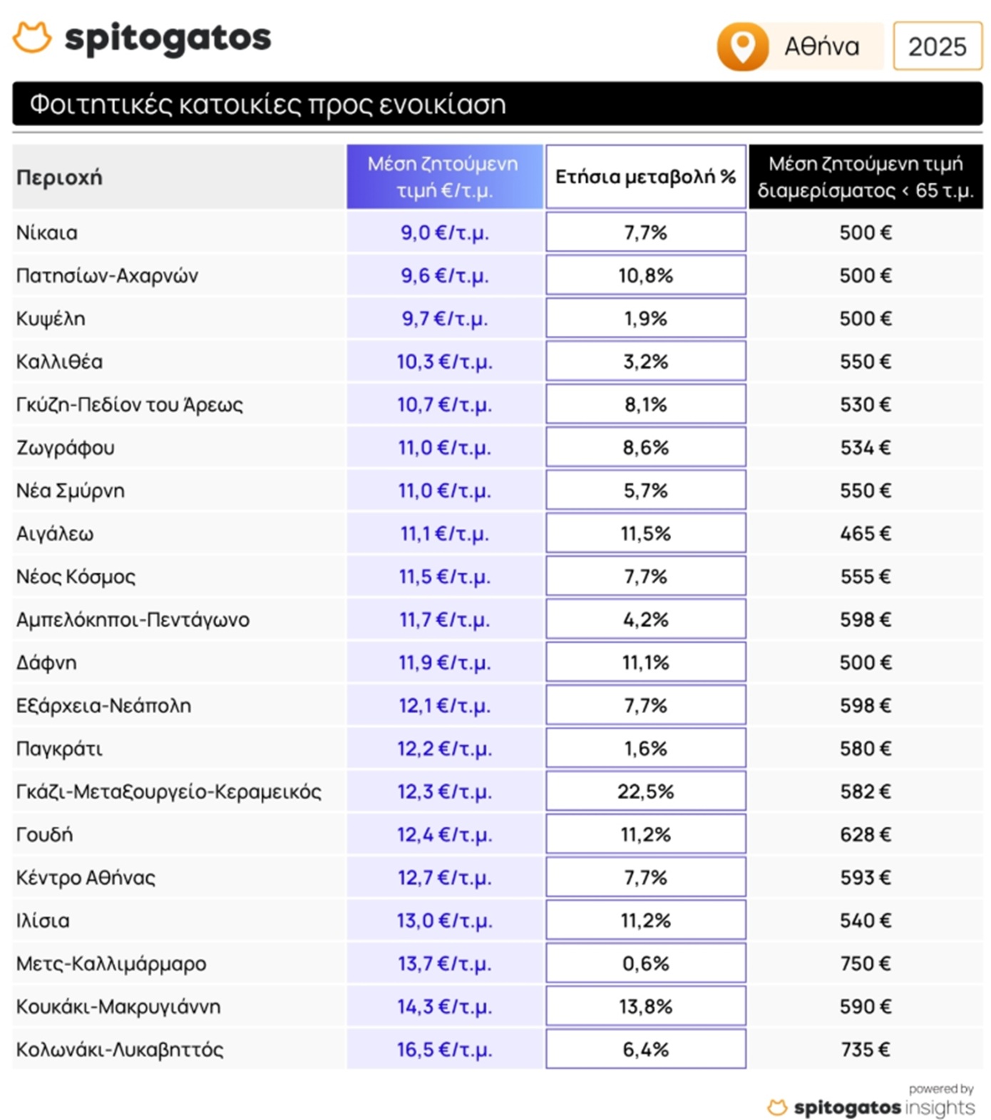 Στις ακριβότερες και παραδοσιακά περιζήτητες περιοχές της Αθήνας όπως το Μετς-Καλλιμάρμαρο, το Κουκάκι-Μακρυγιάννη και το Κολωνάκι-Λυκαβηττός, η μέση ζητούμενη τιμή κυμαίνεται από 13 έως 16,5€/τ.μ. Στου Ζωγράφου, που θεωρείται η πιο φοιτητική περιοχή της πρωτεύουσας λόγω της εγγύτητάς της στην Πανεπιστημιούπολη και την Πολυτεχνειούπολη, ένα φοιτητικό διαμέρισμα κάτω των 65 τ.μ. ζητείται κατά μέσο όρο στα 534 ευρώ.