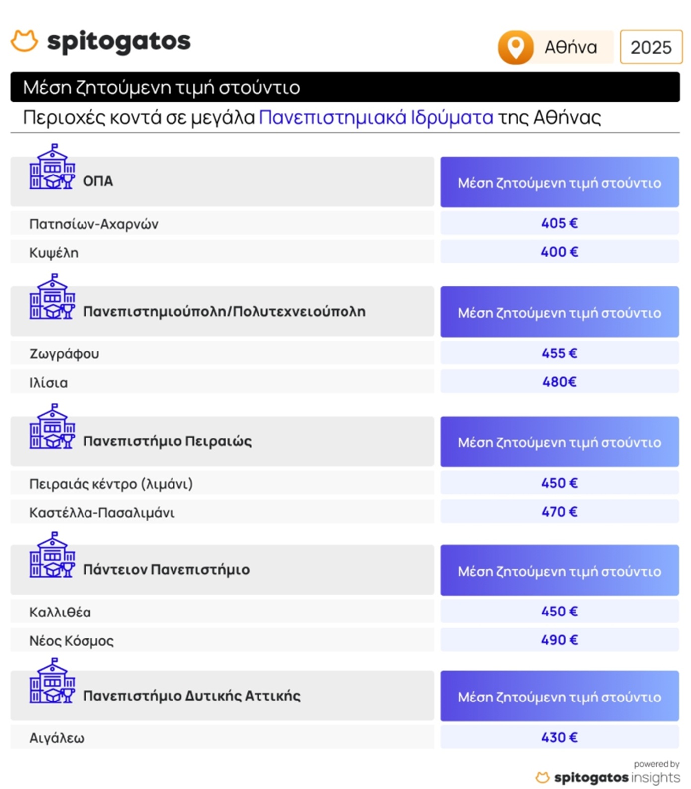 Τα στούντιο παραμένουν ιδιαίτερα δημοφιλή μεταξύ των φοιτητών, λόγω του μικρού τους μεγέθους και της πιο προσιτής τιμής σε σχέση με μεγαλύτερα διαμερίσματα. Για παράδειγμα, σε περιοχές κοντά στο Οικονομικό Πανεπιστήμιο Αθηνών, όπως η Πατησίων-Αχαρνών και η Κυψέλη, η μέση ζητούμενη τιμή ενός στούντιο είναι 405 ευρώ και 400 ευρώ αντίστοιχα.