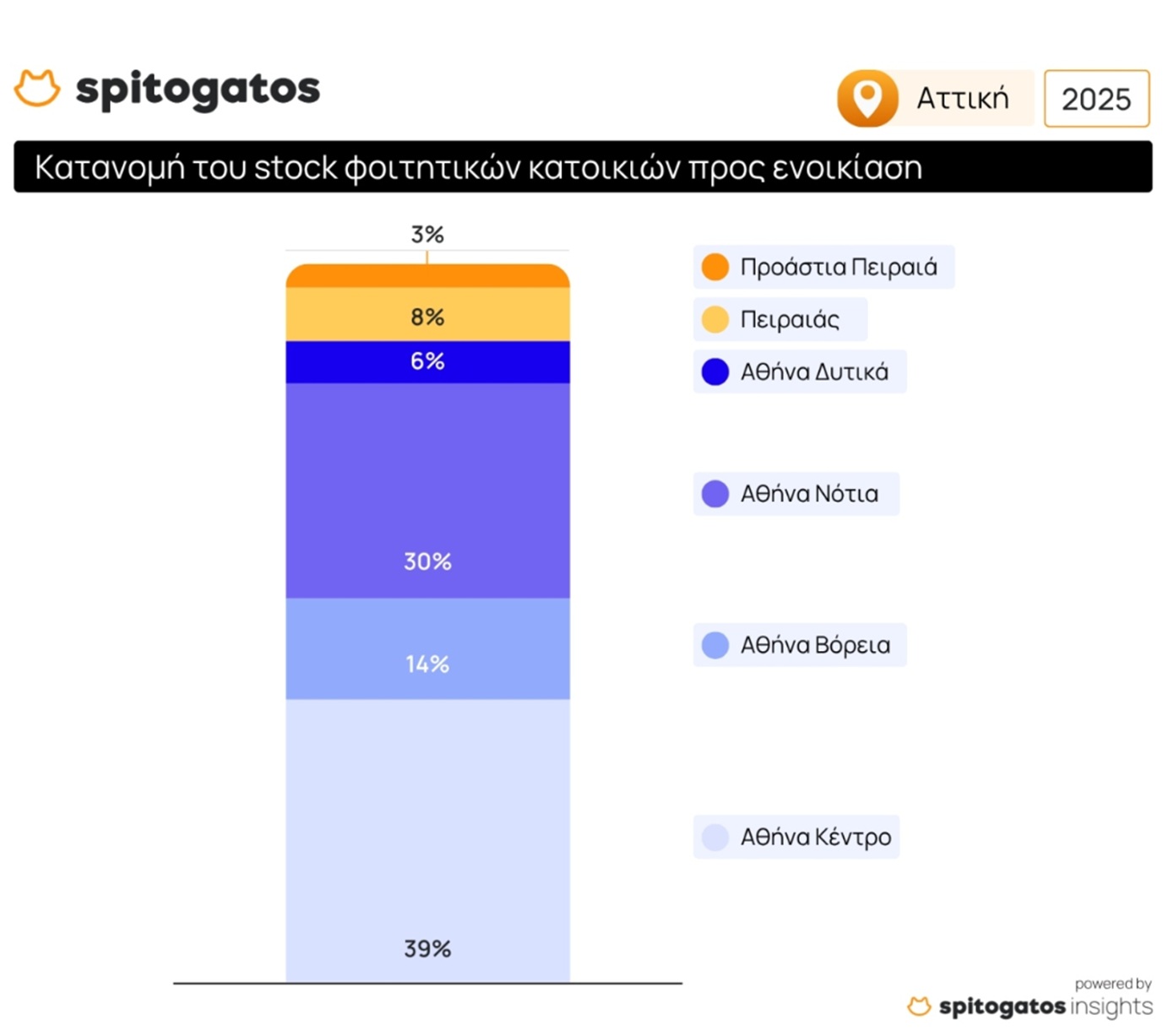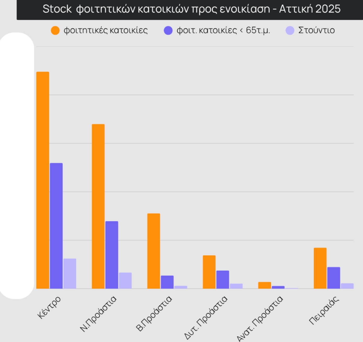 Αναφορικά με την προσφορά φοιτητικής κατοικίας στην Αττική, ο Δήμος Αθηναίων συγκεντρώνει το 39% του διαθέσιμου αποθέματος, ακολουθούμενος από τα Νότια και Βόρεια Προάστια. Ο Πειραιάς και τα προάστιά του καλύπτουν μόλις το 11% της συνολικής προσφοράς. Αναλυτικότερα, ο Δήμος Αθηναίων ξεχωρίζει στο απόθεμα φοιτητικών κατοικιών με διαμερίσματα έως 65 τ.μ. και στούντιο, ενώ οι περιοχές της Δυτικής Αττικής και του Πειραιά εμφανίζουν συγκριτικά περιορισμένη προσφορά.