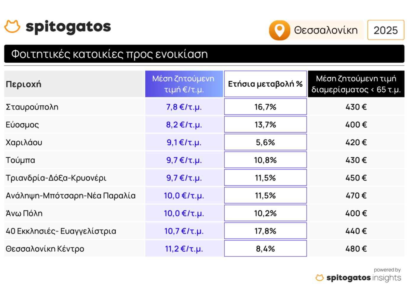 Η Θεσσαλονίκη παρουσίασε σημαντική αύξηση 10,9% στη μέση ζητούμενη τιμή ενοικίασης φοιτητικών κατοικιών το δεύτερο τρίμηνο του 2025, σε σχέση με το αντίστοιχο τρίμηνο του 2024. Οι χαμηλότερες τιμές καταγράφονται στις περιοχές Σταυρούπολης και Ευόσμου, ενώ οι πιο ακριβές αφορούν τις 40 Εκκλησιές-Ευαγγελίστρια και το κέντρο της πόλης.