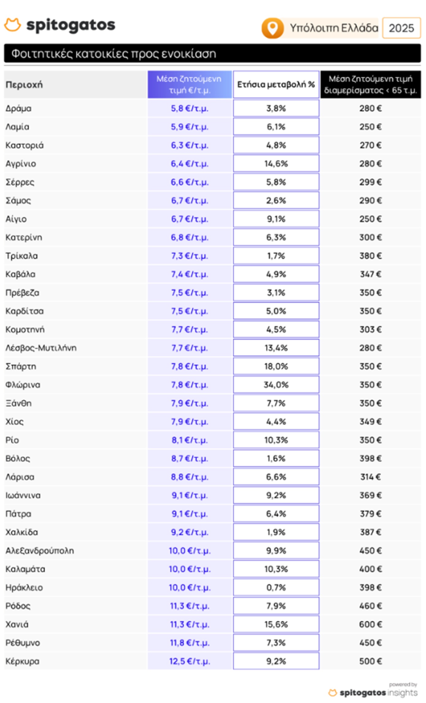 Σε πολλές από τις μεγάλες φοιτητουπόλεις της χώρας παρατηρείται άνοδος στη μέση ζητούμενη τιμή ενοικίασης φοιτητικής κατοικίας κατά το δεύτερο τρίμηνο του 2025 σε σύγκριση με την ίδια περίοδο το 2024. Οι πιο προσιτές περιοχές είναι η Δράμα, η Λαμία και η Καστοριά, ενώ οι υψηλότερες τιμές εντοπίζονται σε τουριστικά δημοφιλείς περιοχές όπως τα Χανιά, η Κέρκυρα και το Ρέθυμνο. Μεγάλα ποσοστά αύξησης καταγράφηκαν επίσης σε Φλώρινα, Σπάρτη και Χανιά.