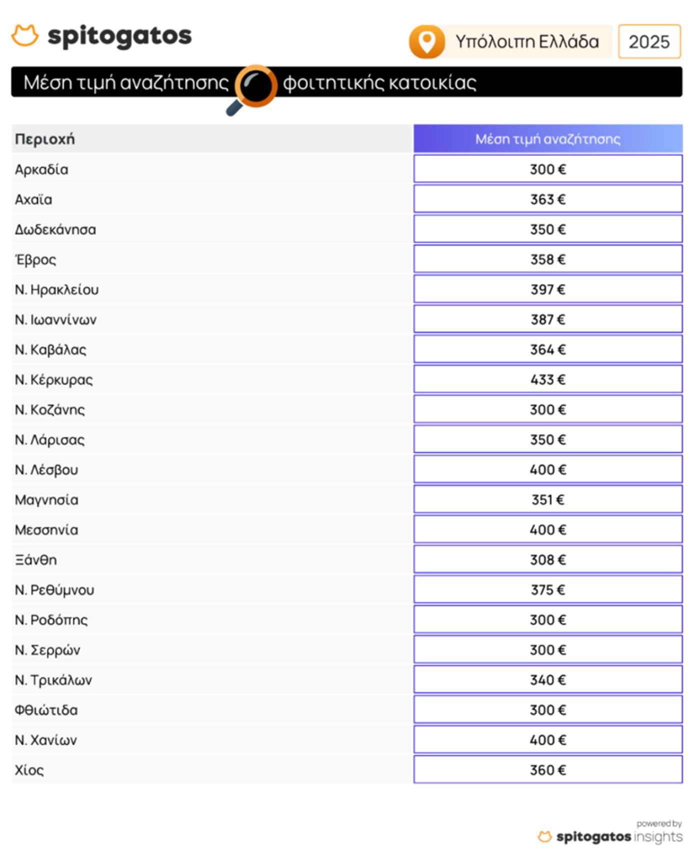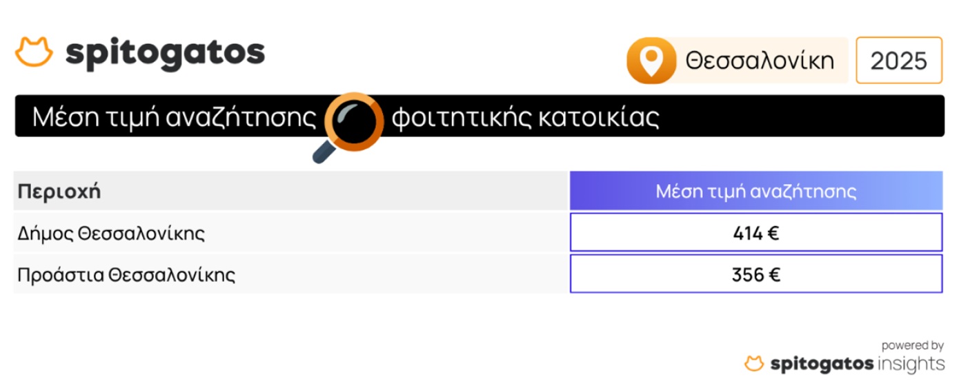 Στη Θεσσαλονίκη, η μέση τιμή αναζήτησης φοιτητικής στέγης στον Δήμο ανέρχεται στα 414 ευρώ, ενώ στα προάστια της πόλης είναι 356 ευρώ. Στην υπόλοιπη Ελλάδα, η μέση τιμή αναζήτησης ανεβαίνει ιδιαίτερα σε τουριστικές περιοχές όπως τα Χανιά, η Κέρκυρα, η Λέσβος και η Μεσσηνία.
