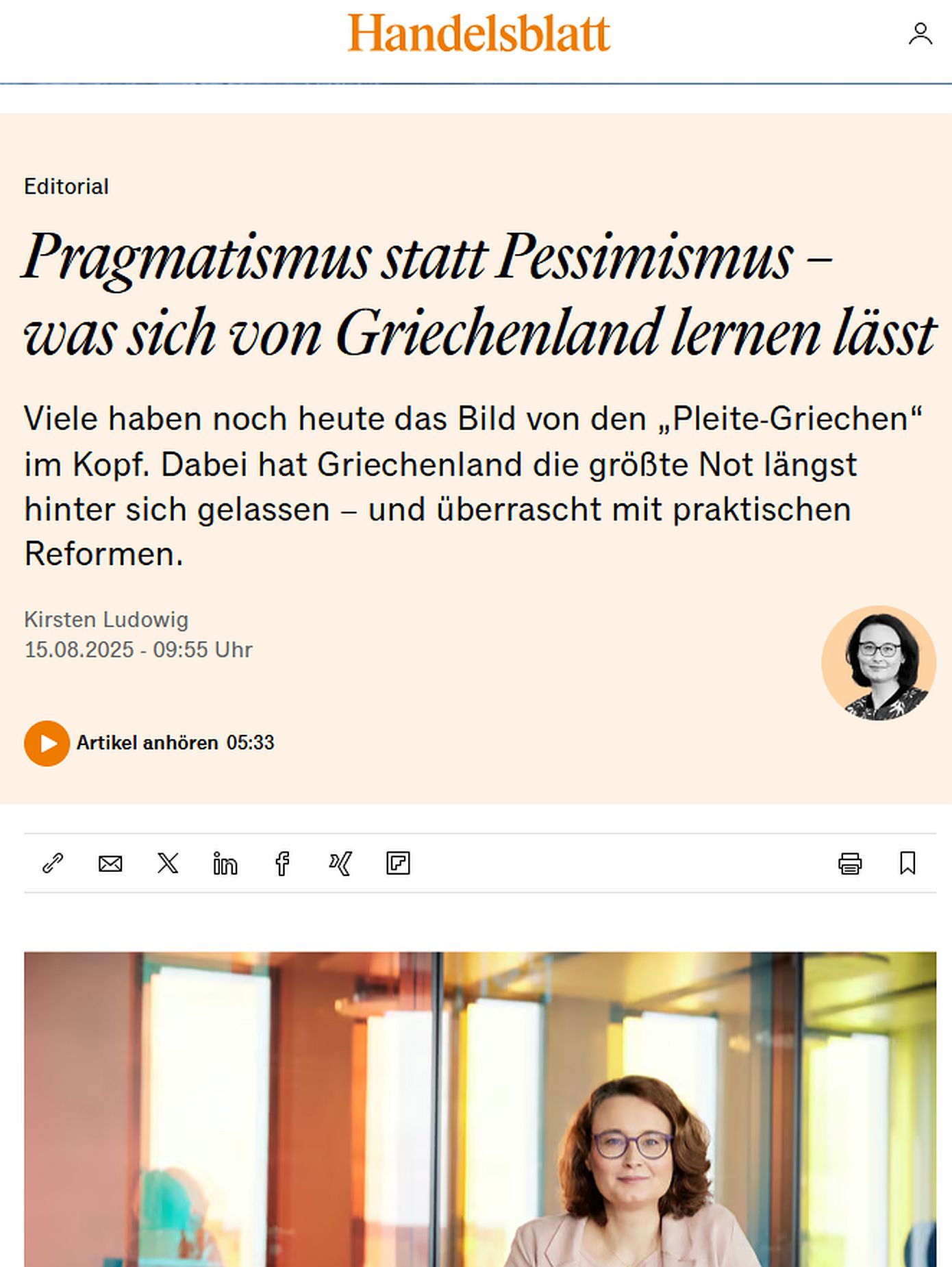 Υπό τον τίτλο «Πραγματισμός αντί για απαισιοδοξία – τι μπορούμε να μάθουμε από την Ελλάδα», η οικονομική εφημερίδα Handelsblatt σχολιάζει την πρόοδο της Ελλάδας και επισημαίνει ότι η χώρα «έχει προ πολλού αφήσει πίσω τις χειρότερες δυσκολίες της και μας εκπλήσσει με πρακτικές μεταρρυθμίσεις».