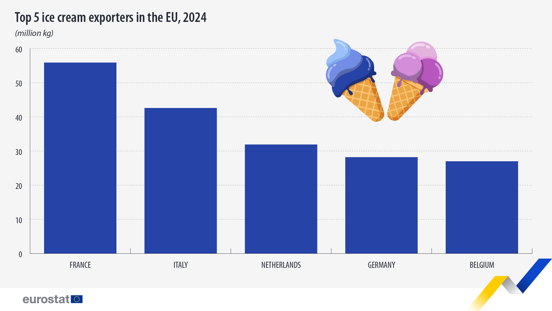 Η Ιταλία ακολούθησε με 42,6 εκατ. κιλά, η Ολλανδία με 31,9 εκατ. κιλά, ενώ η Γερμανία – παρότι πρώτη σε παραγωγή – εξάγει μόλις 28,2 εκατ. κιλά. Ο λόγος; Μάλλον κρατάει το παγωτό της για τους Ευρωπαίους και τους δικούς της καταναλωτές.