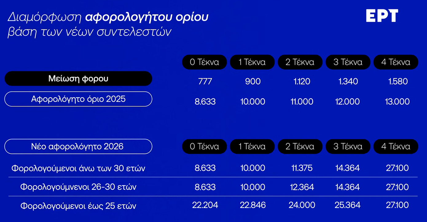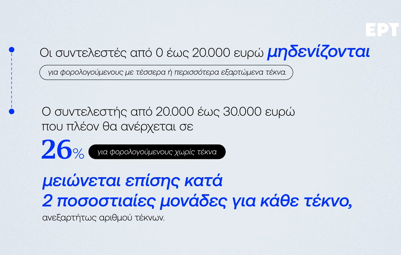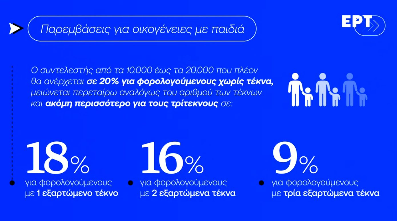 - Μετά τη μείωση των φορολογικών συντελεστών κατά δύο μονάδες για όλους, ειδικά για τους τρίτεκνους, ο συντελεστής μειώνεται από το 22% στο 9% και ειδικά για τους πολύτεκνους μηδενίζεται. Έτσι, το αφορολόγητο για οικογένειες με 4 παιδιά και άνω αυξάνεται στα 27.000 ευρώ.