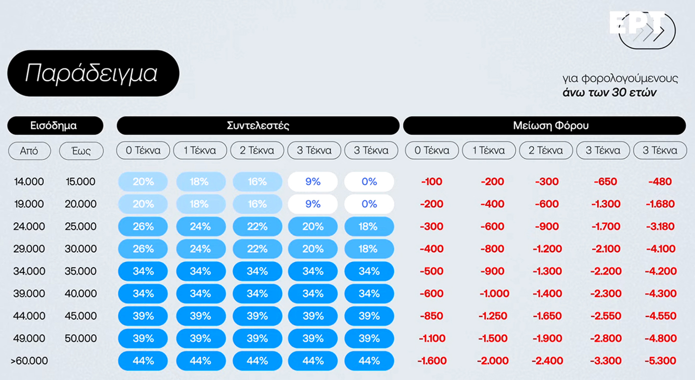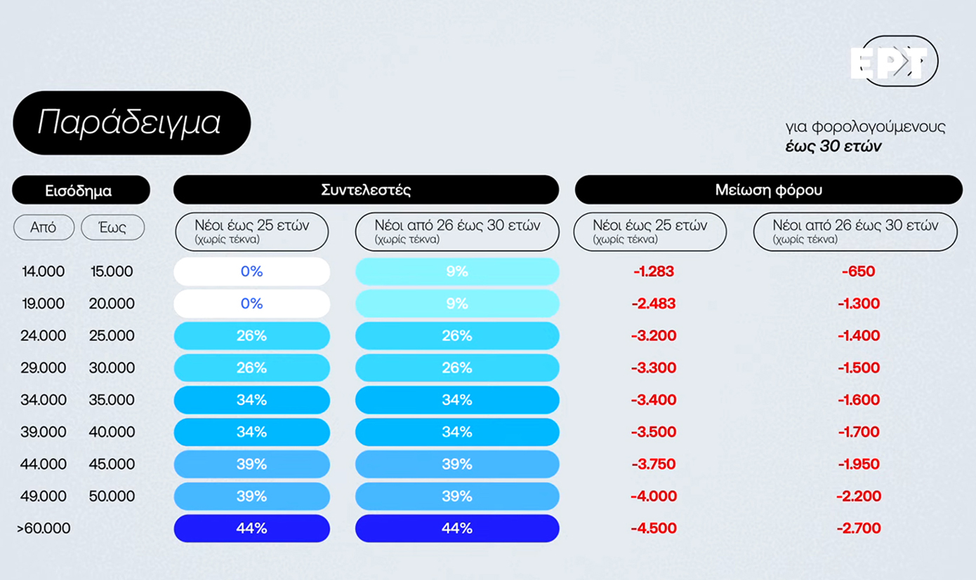 - Ενίσχυση της νέας γενιάς, με στόχο τη μείωση της ανεργίας στις μικρές ηλικίες. Για παράδειγμα, για εισόδημα έως 20.000 ευρώ και άτομα έως 25 ετών, ο συντελεστής μηδενίζεται. Για άτομα 25- 30 ετών, μειώνεται από το 22% στο 9%. Όπως είπε ο υπουργός, έως 30 ετών είναι πάνω από 260.000 άτομα και έως 25 ετών 70.000 άτομα.