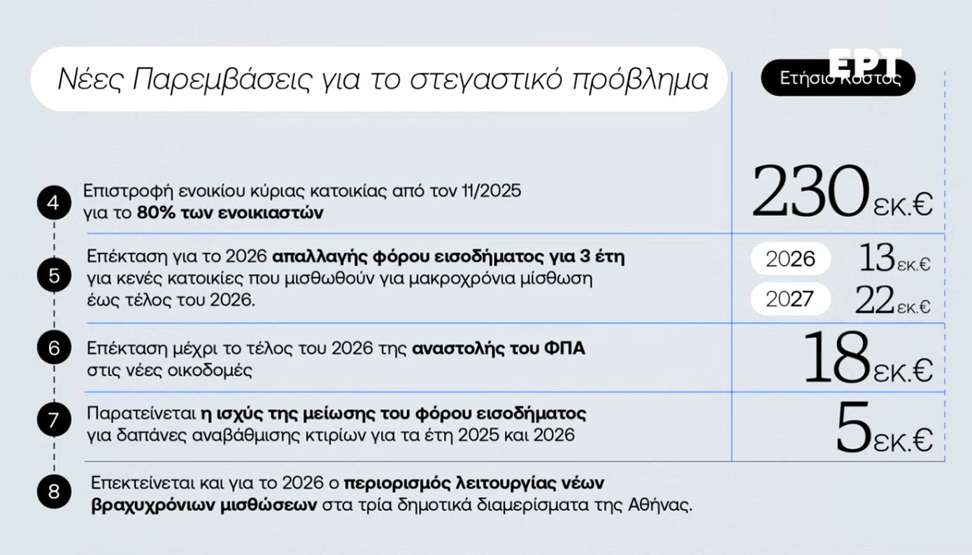- Στα επιμέρους μέτρα, καταργείται το τέλος τηλεόρασης 10%, δημιουργείται το Ταμείο Καινοτομίας Φαρμάκων, αναγνωρίζονται μισθολογικά οι 5ετείς κύκλοι σπουδών και χορηγείται απαλλαγή από τον φόρο για ιδρύματα και κληροδοτήματα.