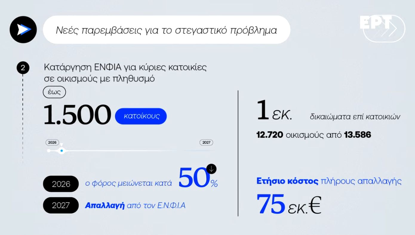 - Ενίσχυση της περιφέρειας, με την κατάργηση του ΕΝΦΙΑ για περιοχές με έως 1.500 κατοίκους (π.χ. αφορά σε Λέσβο, Σάμο, Κω, κ.ά.). Εδώ η λίστα με τους 12.720 οικισμούς που θα καταργηθεί ο ΕΝΦΙΑ μέσα στα επόμενα δύο χρόνια Επίσης, εισάγεται ενδιάμεσος συντελεστής στα ενοίκια 12.000- 24.000 ευρώ (π.χ. ο φόρος των 6.350 ευρώ μπορεί να μειωθεί στα 5.150 ευρώ), επεκτείνεται η απαλλαγή του φόρου για κενά ακίνητα που θα ενοικιαστούν, κ.λπ.