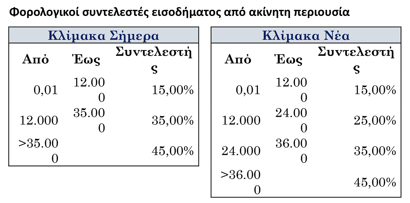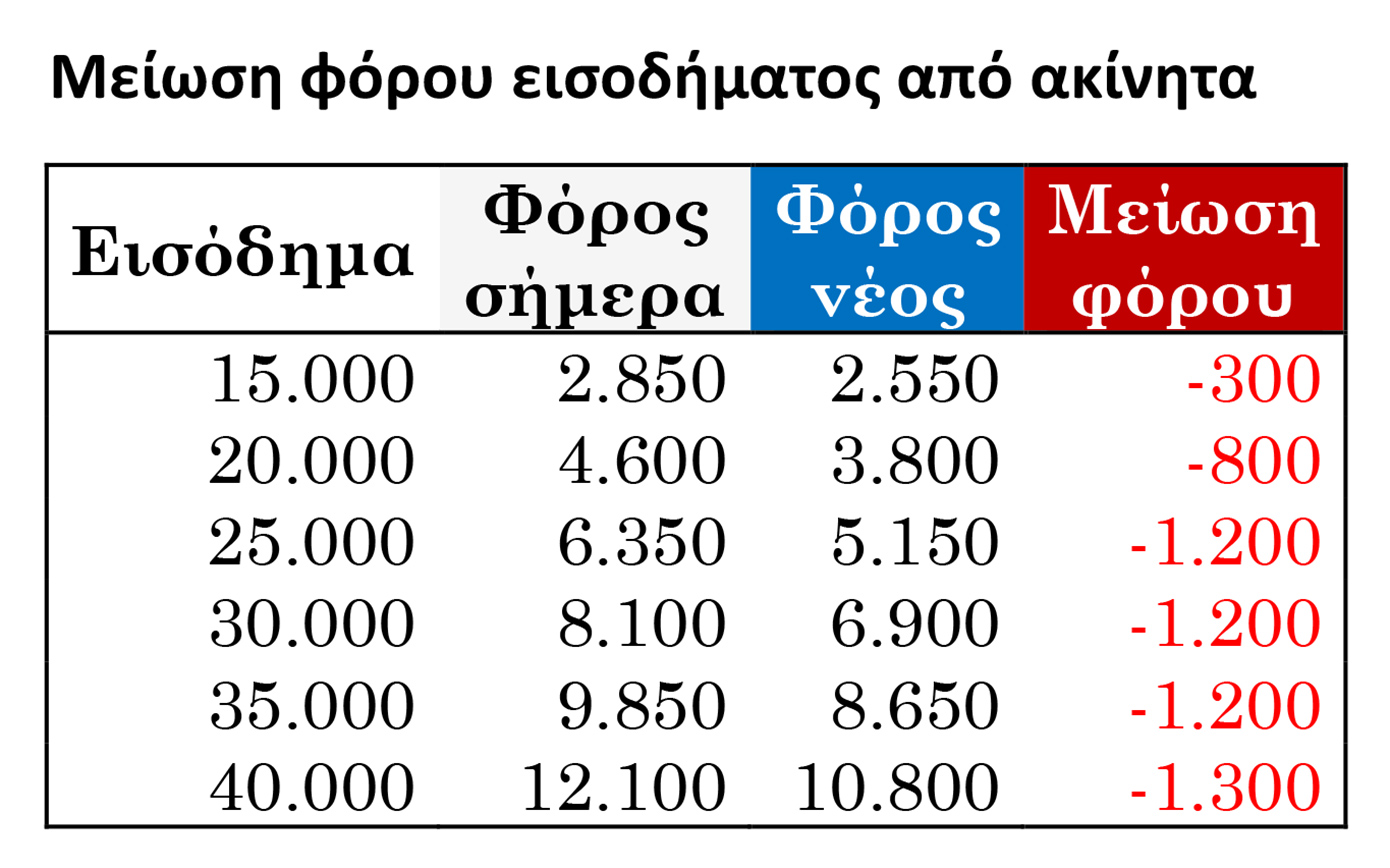 Από το φορολογικό έτος 2026 θεσπίζεται ενδιάμεσος συντελεστής 25% για εισόδημα από ενοίκια από 12.000 έως 24.000 ευρώ. Υπενθυμίζεται ότι σήμερα έως τα 12.000 εφαρμόζεται συντελεστής 15% και στη συνέχεια αυξάνεται σε 35%. Άμεσα ωφελούμενοι εκτιμώνται σε 161.587 ιδιοκτήτες ακινήτων, ωστόσο αυτό το μέτρο αναμένεται να λειτουργήσει θετικά για τη φορολογική συμμόρφωση και τη συγκράτηση των τιμών των ενοικίων. Το δημοσιονομικό κόστος εκτιμάται σε 90 εκατ. ευρώ ετησίως που θα επιβαρύνει τα έτη 2027 και επόμενα.