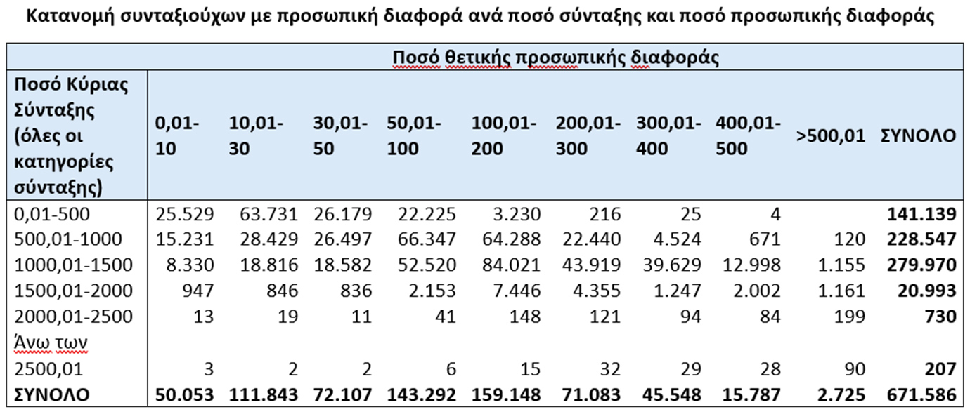 - Από τον Ιανουάριο του 2026 και σε μόνιμη βάση όλοι οι συνταξιούχοι θα λαμβάνουν αύξηση βάσει πληθωρισμού και ΑΕΠ καθώς δεν θα συμψηφίζεται το 50% της προσωπικής διαφοράς με την αύξηση της σύνταξης, ενώ από τον Ιανουάριο του 2027 καταργείται πλήρως ο συμψηφισμός της προσωπικής διαφοράς με την αύξηση της σύνταξης. Το δημοσιονομικό κόστος εκτιμάται σε 75 εκατ. ευρώ για το 2026, αυξανόμενο κατά επιπλέον 135 εκατ. ευρώ το 2027, 113 εκατ. ευρώ το 2028, 106 εκατ. ευρώ το 2029 κτλ. Άμεσα ωφελούμενοι είναι περίπου 671.000 συνταξιούχοι με προσωπική διαφορά.