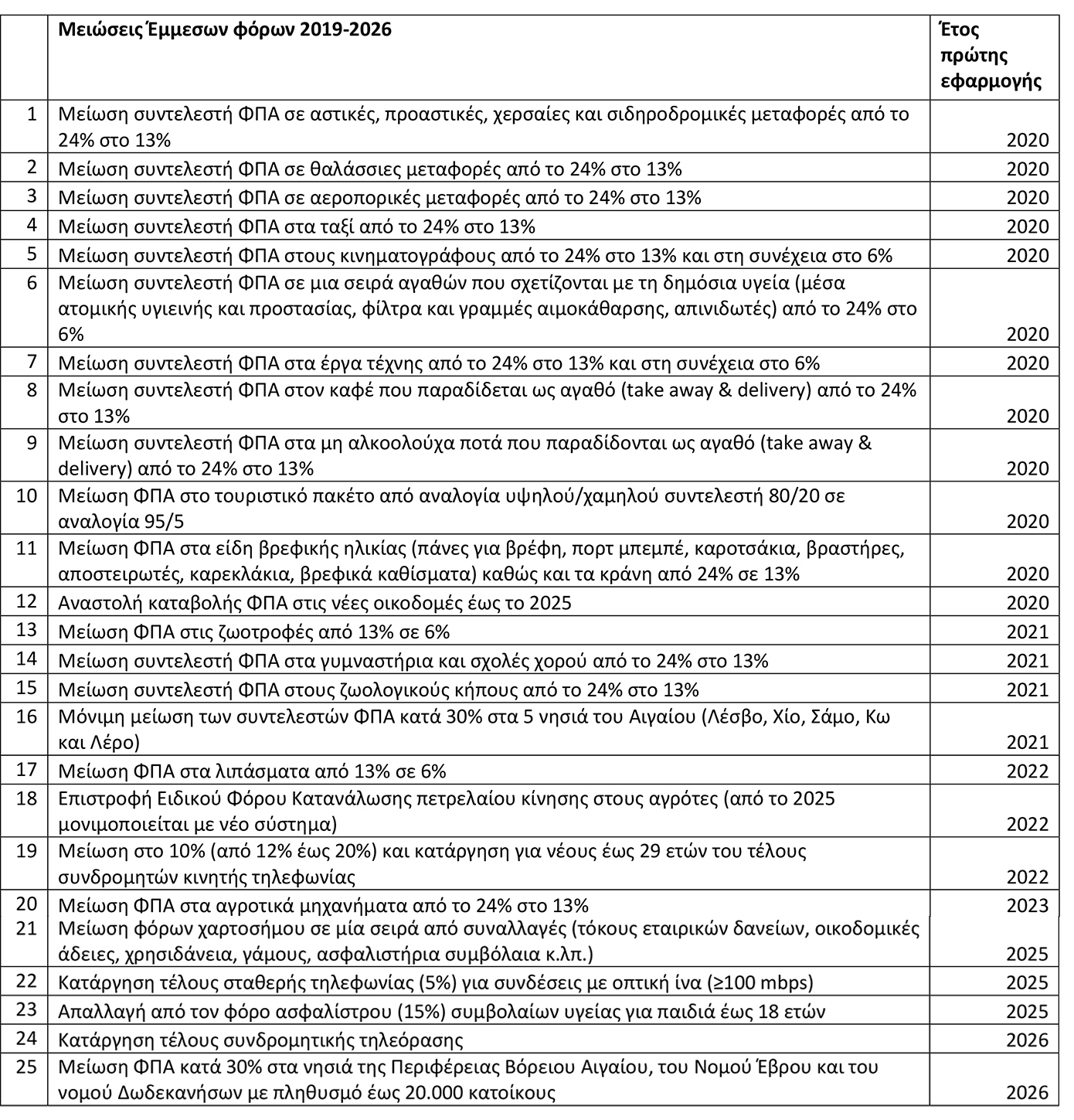Μειώσεις Έμμεσων φόρων 2019-2026 – Έτος πρώτης εφαρμογής