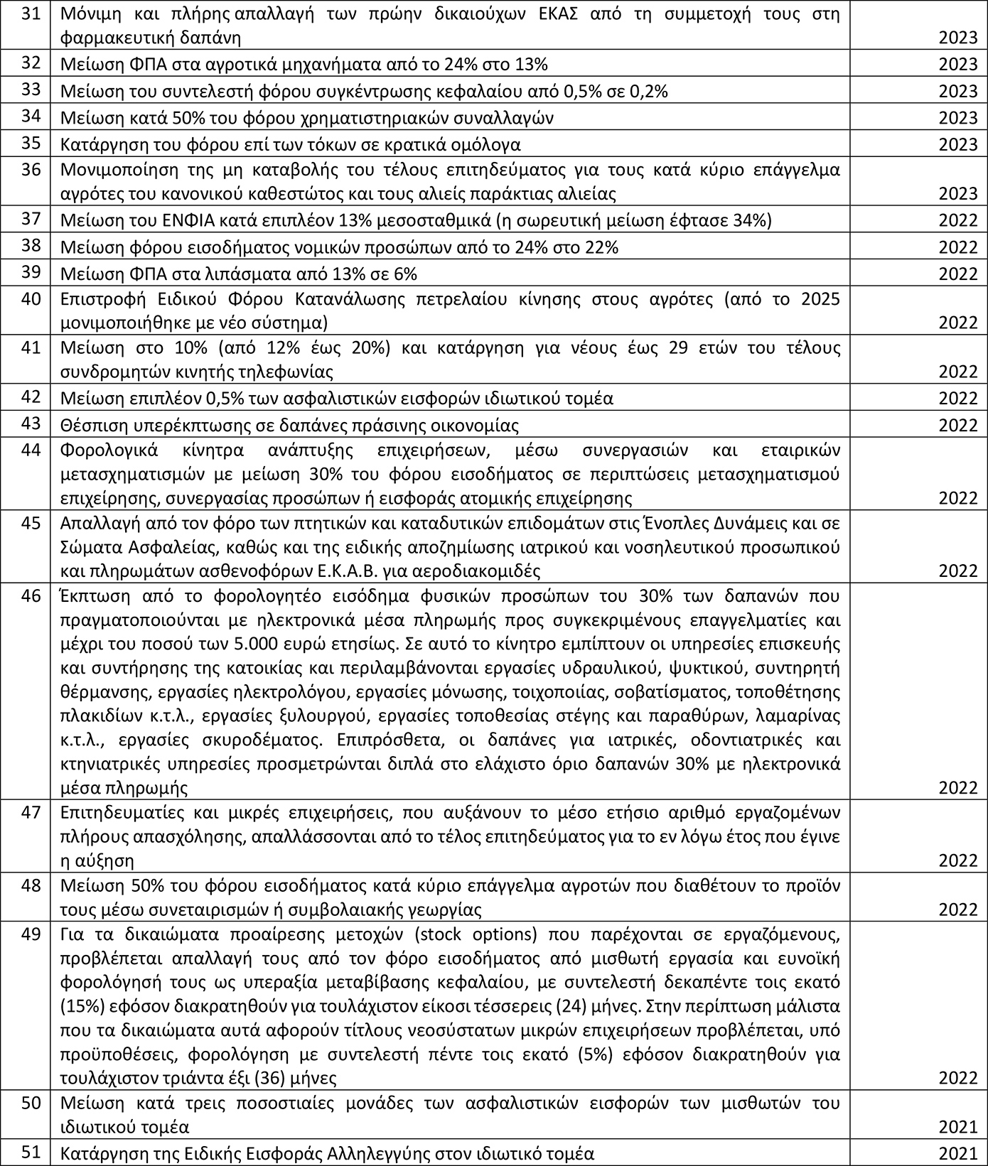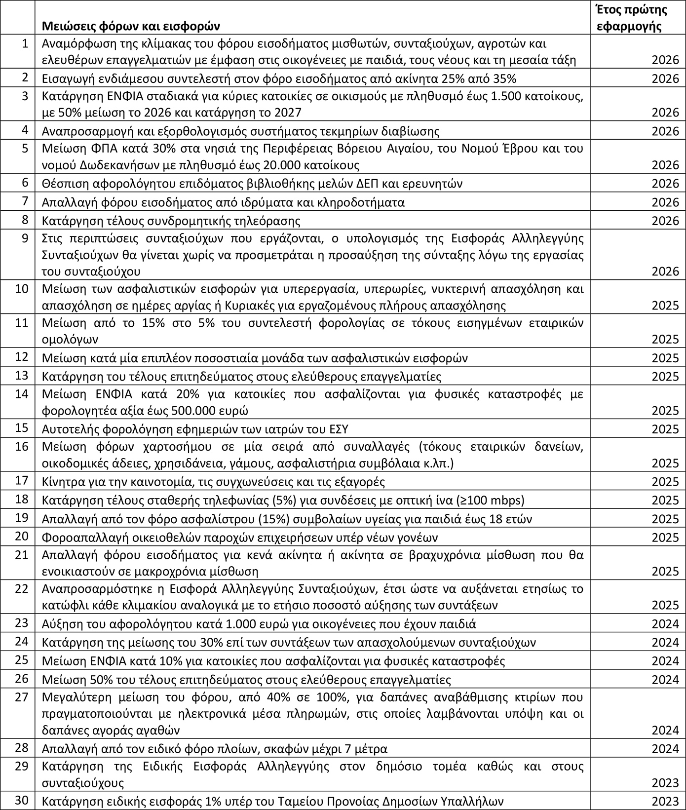 Μειώσεις φόρων και εισφορών – Έτος πρώτης εφαρμογής