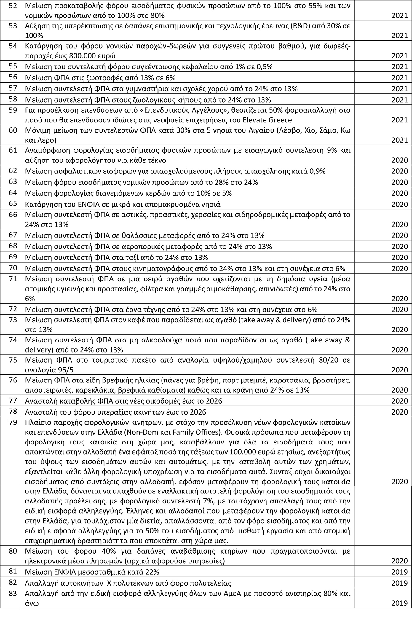 71. Μείωση συντελεστή ΦΠΑ σε μια σειρά αγαθών που σχετίζονται με τη δημόσια υγεία (μέσα ατομικής υγιεινής και προστασίας, φίλτρα και γραμμές αιμοκάθαρσης, απινιδωτές) από το 24% στο 6% 2020