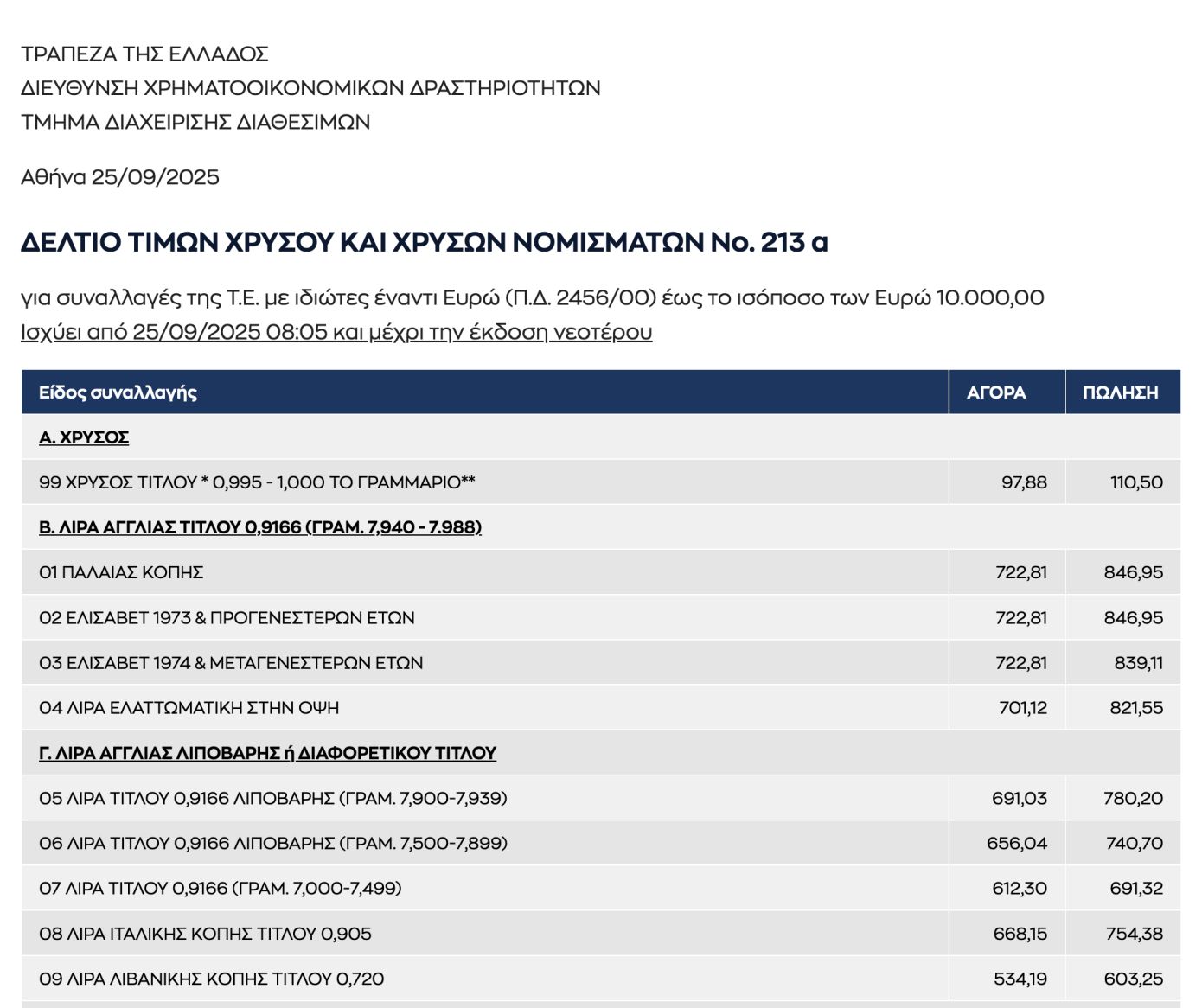 Στις συναλλαγές πώλησης χρυσών λιρών Αγγλίας από την Τράπεζα της Ελλάδος εισπράττεται προμήθεια 5‰ με ελάχιστο τα 3 ευρώ.