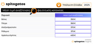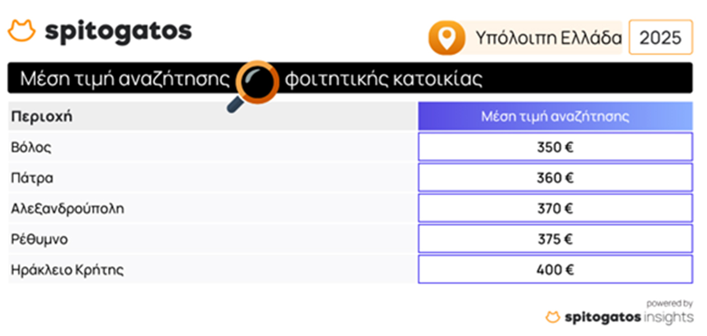 Η μέση τιμή αναζήτησης φοιτητικής κατοικίας στην περιφέρεια κυμαίνεται από 350 ευρώ στον Βόλο, 360 ευρώ στην Πάτρα, 370 ευρώ στην Αλεξανδρούπολη, και 375-400 ευρώ σε Ρέθυμνο και Ηράκλειο Κρήτης. Η άνοδος των τιμών αντανακλά την υψηλή ζήτηση λίγο πριν την έναρξη του ακαδημαϊκού έτους, τις καθυστερήσεις στην αναζήτηση κατοικίας από φοιτητές και γονείς, καθώς και τις περιορισμένες διαθέσιμες επιλογές σε κεντρικές και δημοφιλείς περιοχές. Οι αυξήσεις αυτές δημιουργούν πρόσθετη πίεση στον οικογενειακό προϋπολογισμό, ενώ οι φοιτητές αντιμετωπίζουν μεγαλύτερη δυσκολία στην εξεύρεση κατάλληλης στέγης σε προσιτές τιμές.