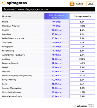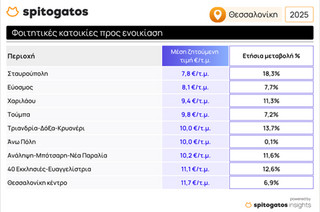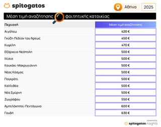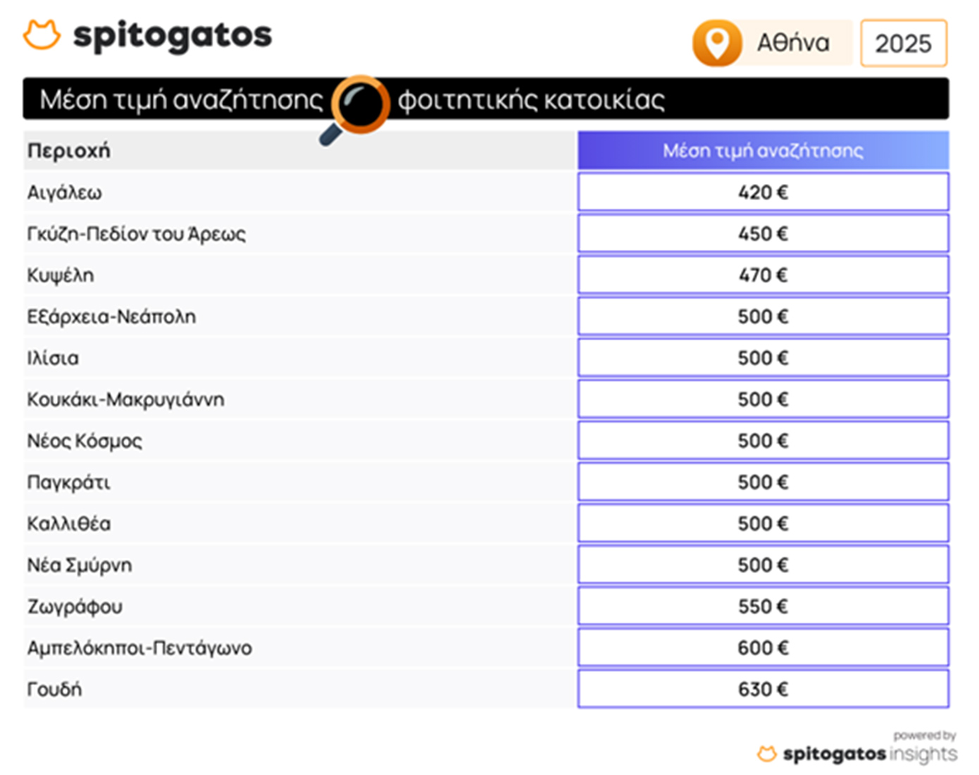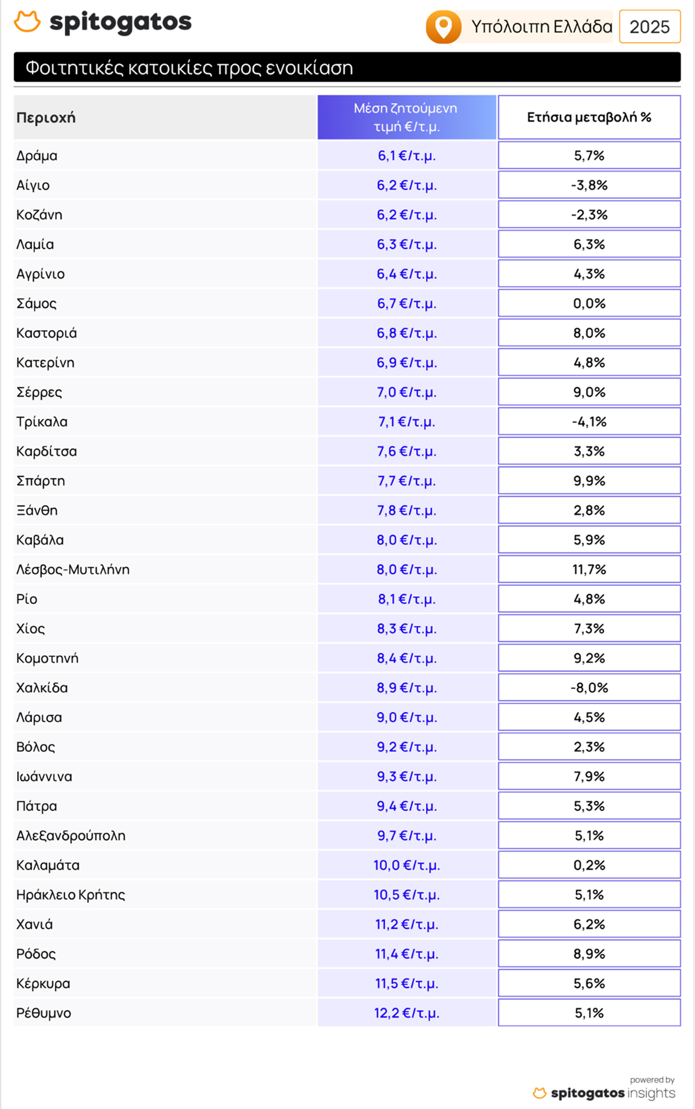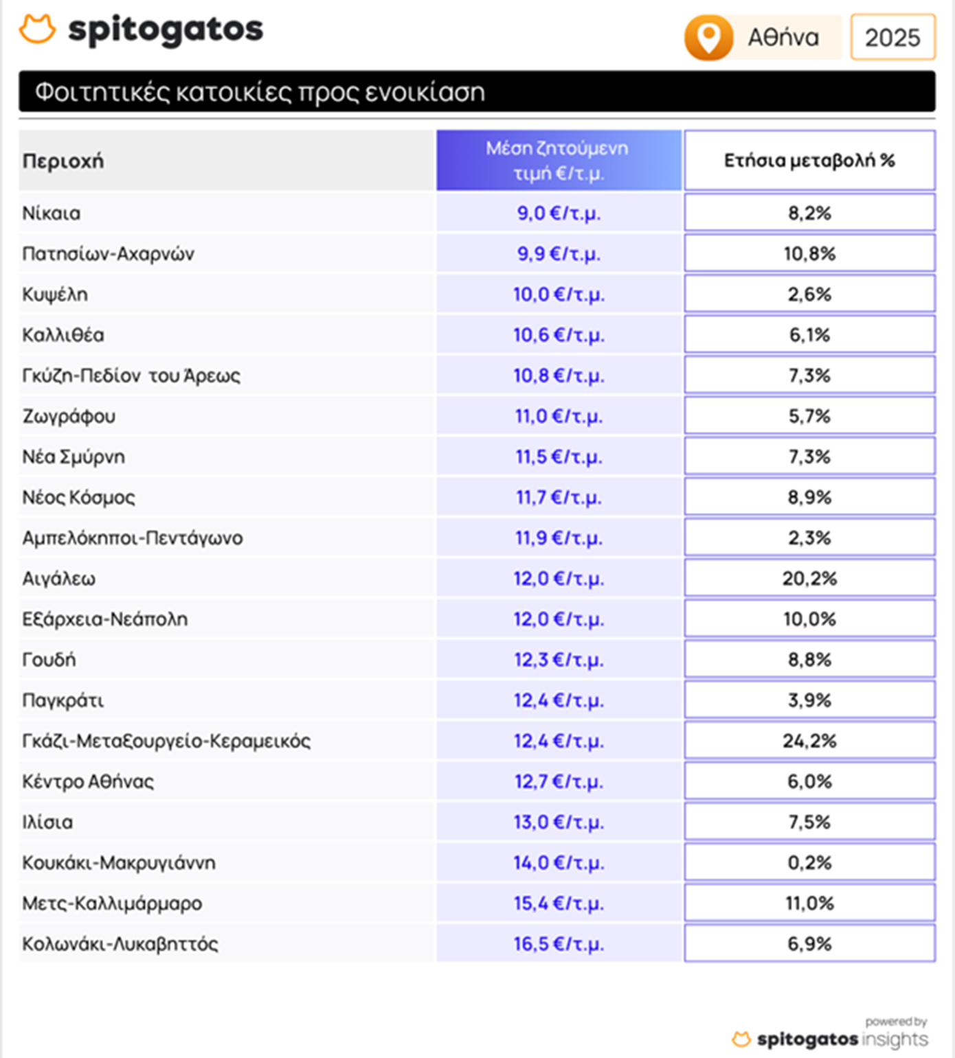 Η αύξηση των μέσων ζητούμενων τιμών (ΜΖΤ) ενοικίασης φοιτητικών κατοικιών σε όλη τη χώρα έφτασε το 6,6% κατά την περίοδο Ιουλίου-Αυγούστου 2025 σε σχέση με την αντίστοιχη περσινή περίοδο, σύμφωνα με τα στοιχεία του Spitogatos. Σε ορισμένες περιοχές της Αθήνας, όπως Αιγάλεω, Γκάζι, Μεταξουργείο και Κεραμεικός, η αύξηση ξεπέρασε το 20%, ενώ στη Θεσσαλονίκη η άνοδος άγγιξε το 10%. Η μέση τιμή αναζήτησης κυμαίνεται από 420 έως 600 ευρώ και άνω, ανάλογα με τη γειτονιά και την εγγύτητα σε πανεπιστημιακές εγκαταστάσεις.