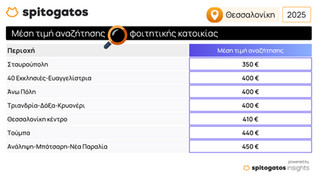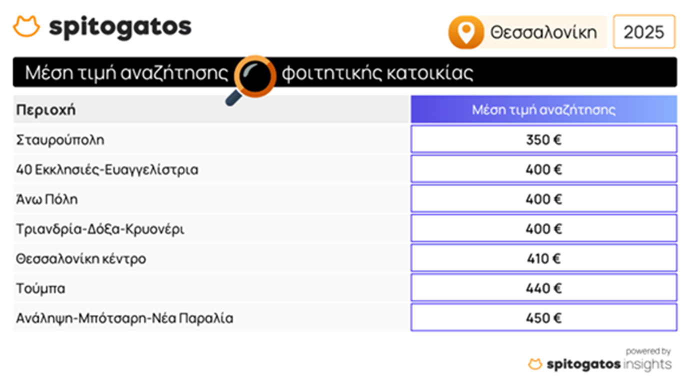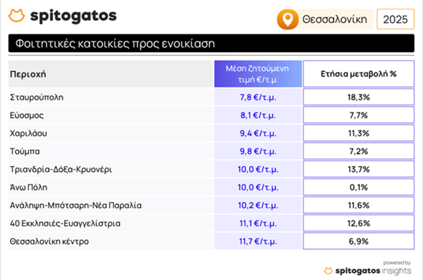 Στη Θεσσαλονίκη, οι ΜΖΤ ενοικίασης φοιτητικών κατοικιών παρουσίασαν επίσης άνοδο κατά την περίοδο Ιουλίου-Αυγούστου 2025. Σημαντικές αυξήσεις σημειώθηκαν στη Σταυρούπολη και στις περιοχές Τριανδρία-Δόξα-Κρυονέρι, όπου η ΜΖΤ διαμορφώθηκε στα 10 ευρώ/τ.μ., καταγράφοντας άνοδο 13,7% σε σχέση με το προηγούμενο έτος. Οι πιο οικονομικές επιλογές παραμένουν στη Σταυρούπολη και τον Εύοσμο, ενώ οι υψηλότερες τιμές συναντώνται στο κέντρο της Θεσσαλονίκης και στην περιοχή 40 Εκκλησιές–Ευαγγελίστρια, με ετήσια αύξηση 12,6%. Η μέση τιμή αναζήτησης κυμαίνεται από 350 ευρώ σε περιοχές χαμηλής ζήτησης όπως Σταυρούπολη, 440 ευρώ στην Τούμπα και 450 ευρώ στην Ανάληψη-Μπότσαρη-Νέα Παραλία, ενώ στο κέντρο της Θεσσαλονίκης διαμορφώνεται στα 410 ευρώ.