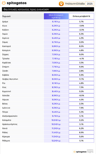 Στην υπόλοιπη Ελλάδα, οι περισσότερες φοιτητουπόλεις κατέγραψαν αύξηση στις ΜΖΤ, με μερικές εξαιρέσεις όπως Τρίκαλα (-4,1%), Χαλκίδα (-8%) και Αίγιο (-3,8%). Οι χαμηλότερες τιμές, κάτω των 7 ευρώ/τ.μ., εντοπίζονται σε Δράμα, Αίγιο, Κοζάνη, Λαμία, Αγρίνιο, Σάμο, Καστοριά και Κατερίνη, ενώ οι υψηλότερες τιμές, άνω των 9 ευρώ/τ.μ., παρατηρούνται σε Λάρισα, Βόλο, Ιωάννινα, Πάτρα, Αλεξανδρούπολη και Καλαμάτα. Περιοχές με έντονη τουριστική δραστηριότητα, όπως Ηράκλειο, Χανιά, Ρόδος, Κέρκυρα και Ρέθυμνο, συνεχίζουν να εμφανίζουν υψηλές ΜΖΤ.