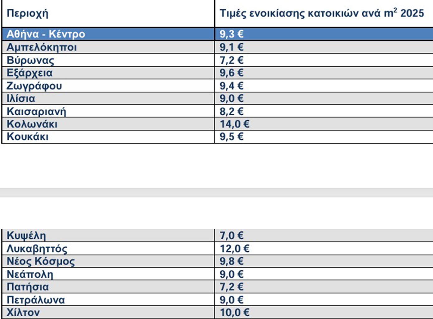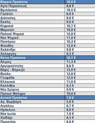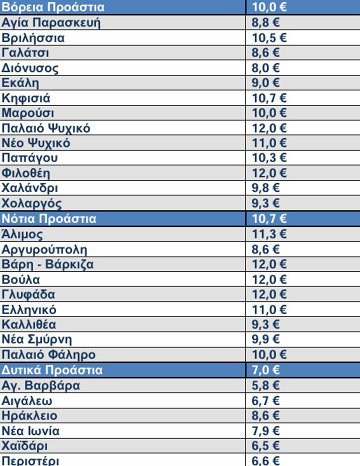 Στις υπόλοιπες περιοχές της Αθήνας, οι τιμές διαμορφώνονται ως εξής: Αμπελόκηποι 9,1 ευρώ ανά τ.μ., Ζωγράφου 9,4 ευρώ, Κουκάκι 9,5 ευρώ, Εξάρχεια 9,6 ευρώ, Νέος Κόσμος 9,8 ευρώ, περιοχή Χίλτον 10 ευρώ και Λυκαβηττός 12 ευρώ ανά τ.μ.