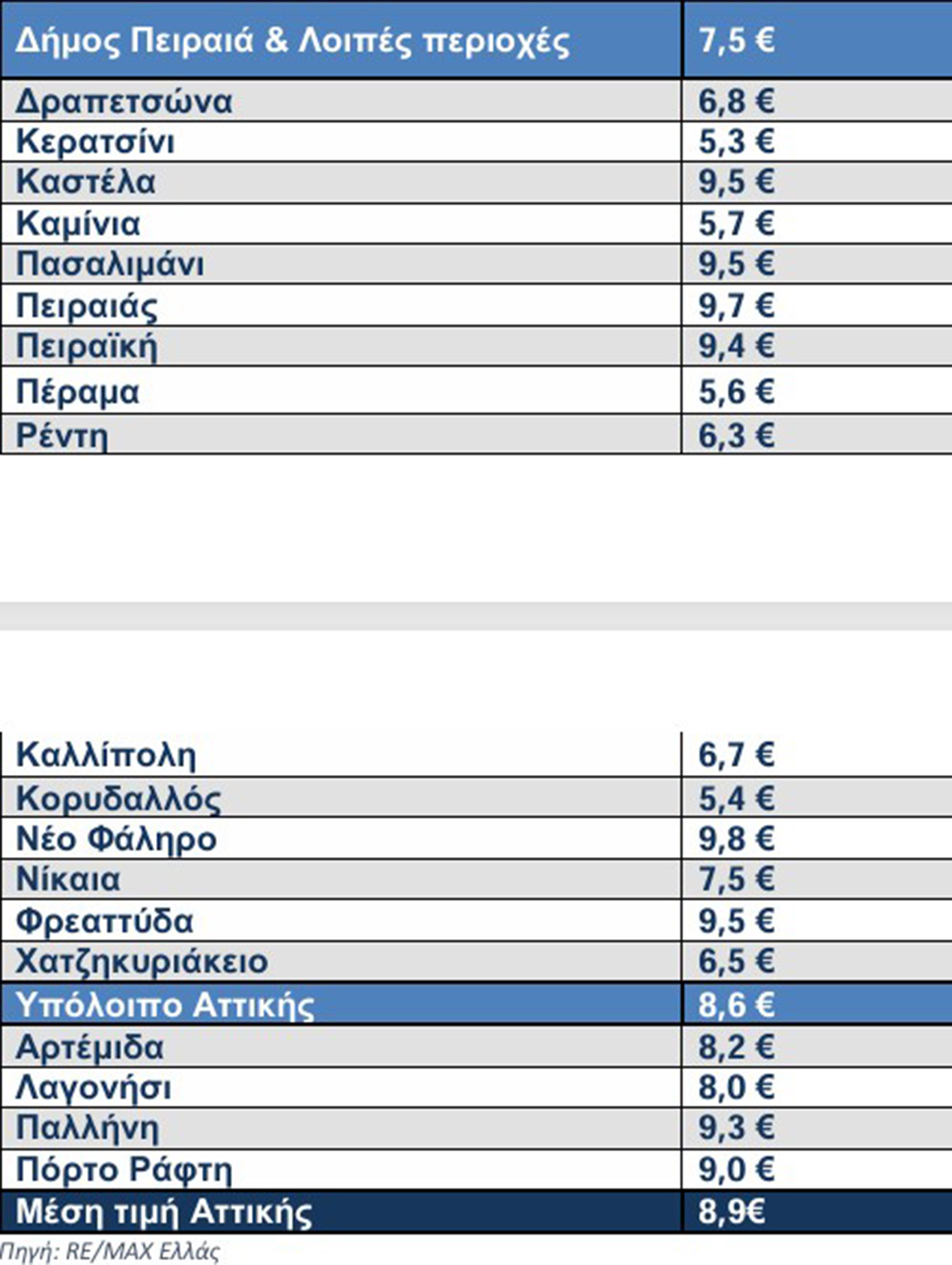 Στον Πειραιά και τις γύρω περιοχές, η μέση τιμή ενοικίασης φτάνει τα 7,5 ευρώ ανά τ.μ., με χαμηλότερα ενοίκια σε Κερατσίνι (5,3 ευρώ), Κορυδαλλό (5,4 ευρώ), Πέραμα (5,6 ευρώ) και Καμίνια (5,7 ευρώ). Αντίθετα, πάνω από 7,5 ευρώ καταγράφονται σε Πειραϊκή (9,4 ευρώ), Καστέλα και Πασαλιμάνι (9,5 ευρώ), Πειραιά (9,7 ευρώ) και Νέο Φάληρο (9,8 ευρώ). Συνολικά, η μέση τιμή ενοικίασης στην Αττική ανέρχεται στα 8,9 ευρώ ανά τ.μ.