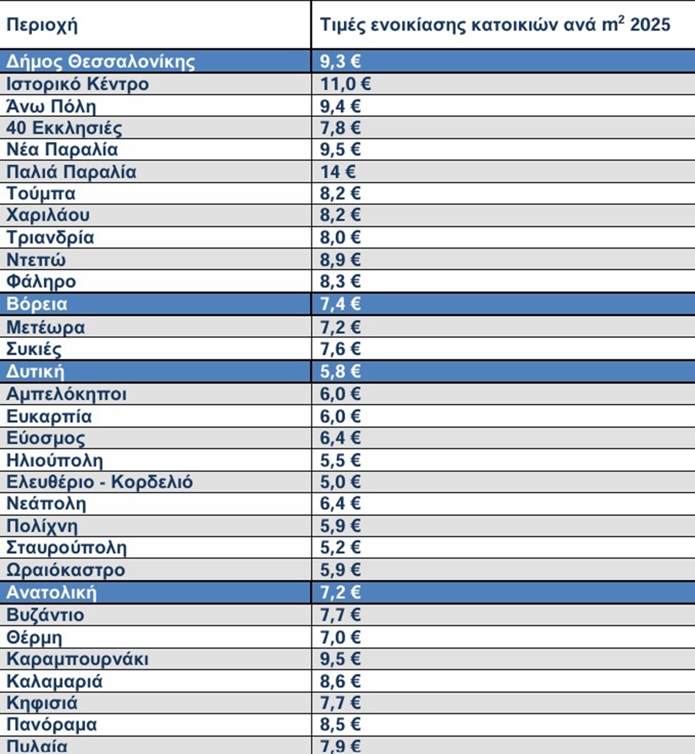 Στον Δήμο Θεσσαλονίκης, η χαμηλότερη μέση τιμή καταγράφεται στις 40 Εκκλησιές (7,8 ευρώ ανά τ.μ.), με επόμενες περιοχές την Τριανδρία (8 ευρώ), Τούμπα και Χαριλάου (8,2 ευρώ) και Φάληρο (8,3 ευρώ). Αντίθετα, οι υψηλότερες μέσες τιμές εμφανίζονται στην Άνω Πόλη (9,4 ευρώ), Νέα Παραλία (9,5 ευρώ) και Ιστορικό Κέντρο (11 ευρώ).