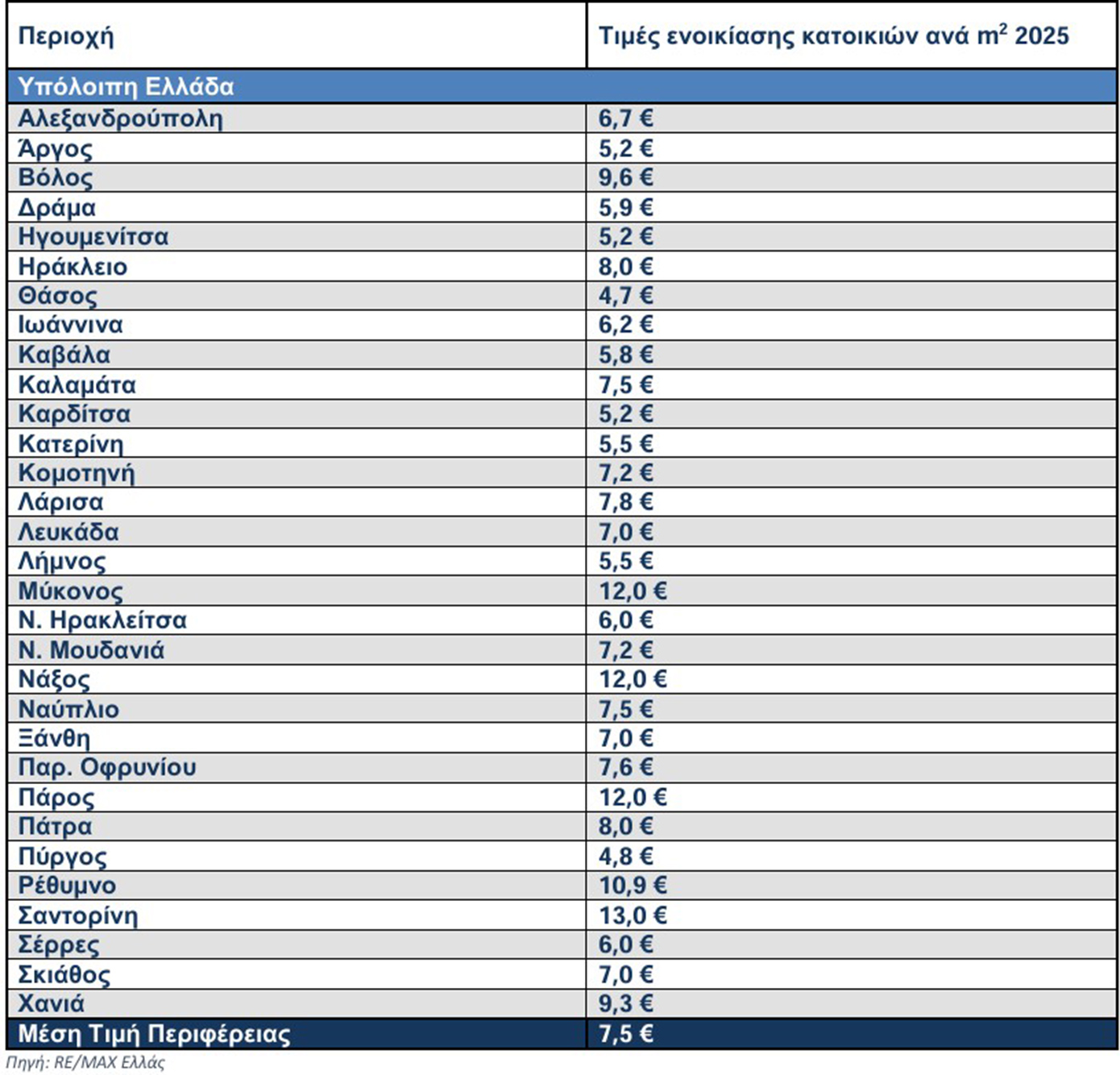 Στην περιφέρεια σημειώνεται η μεγαλύτερη άνοδος, με μέση τιμή ενοικίων 7,5 ευρώ ανά τ.μ., υψηλότερη από τη Θεσσαλονίκη αλλά χαμηλότερη από την Αθήνα. Ενοικίαση κάτω από 7,5 ευρώ ανά τ.μ. εντοπίζεται σε Θάσο (4,7 ευρώ), Πύργο (4,8 ευρώ), Άργος, Καρδίτσα και Ηγουμενίτσα (5,2 ευρώ), Κατερίνη και Λήμνο (5,5 ευρώ), Καβάλα (5,8 ευρώ), Σέρρες (6 ευρώ), Ιωάννινα (6,2 ευρώ) και Αλεξανδρούπολη (6,7 ευρώ). Αντίθετα, οι υψηλότερες μέσες τιμές σημειώνονται σε Σαντορίνη (13 ευρώ), Μύκονο, Πάρο και Νάξο (12 ευρώ) και Ρέθυμνο (10,9 ευρώ).