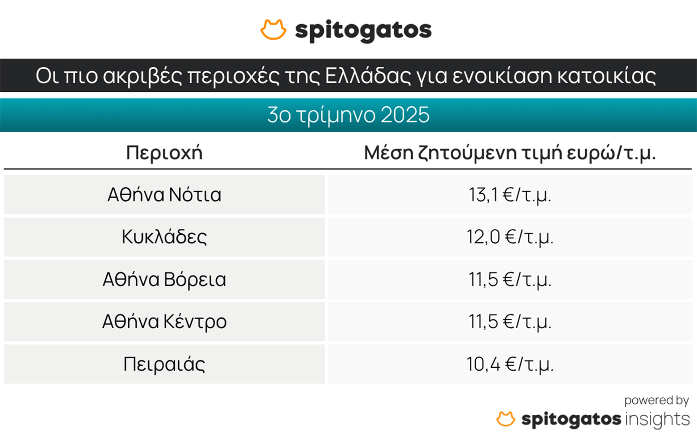 Στην Αττική, τα Νότια Προάστια συνεχίζουν να καταγράφουν τις υψηλότερες τιμές πώλησης κατοικιών, με ΜΖΤ 4.091 ευρώ/τ.μ., ακολουθούμενα από τις Κυκλάδες, τα Βόρεια Προάστια, την Π.Ε. Λευκάδας και την Π.Ε. Χανίων, με ΜΖΤ 2.878 ευρώ/τ.μ. Στην πλευρά της ενοικίασης, τα Νότια Προάστια διατηρούν την πρωτοκαθεδρία με ΜΖΤ 13,1 ευρώ/τ.μ., ενώ ακολουθούν οι Κυκλάδες, τα Βόρεια Προάστια της Αθήνας, το κέντρο της πόλης και ο Πειραιάς με ΜΖΤ 10,4 ευρώ/τ.μ.