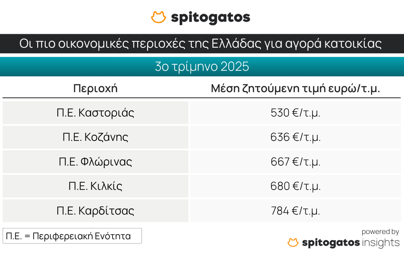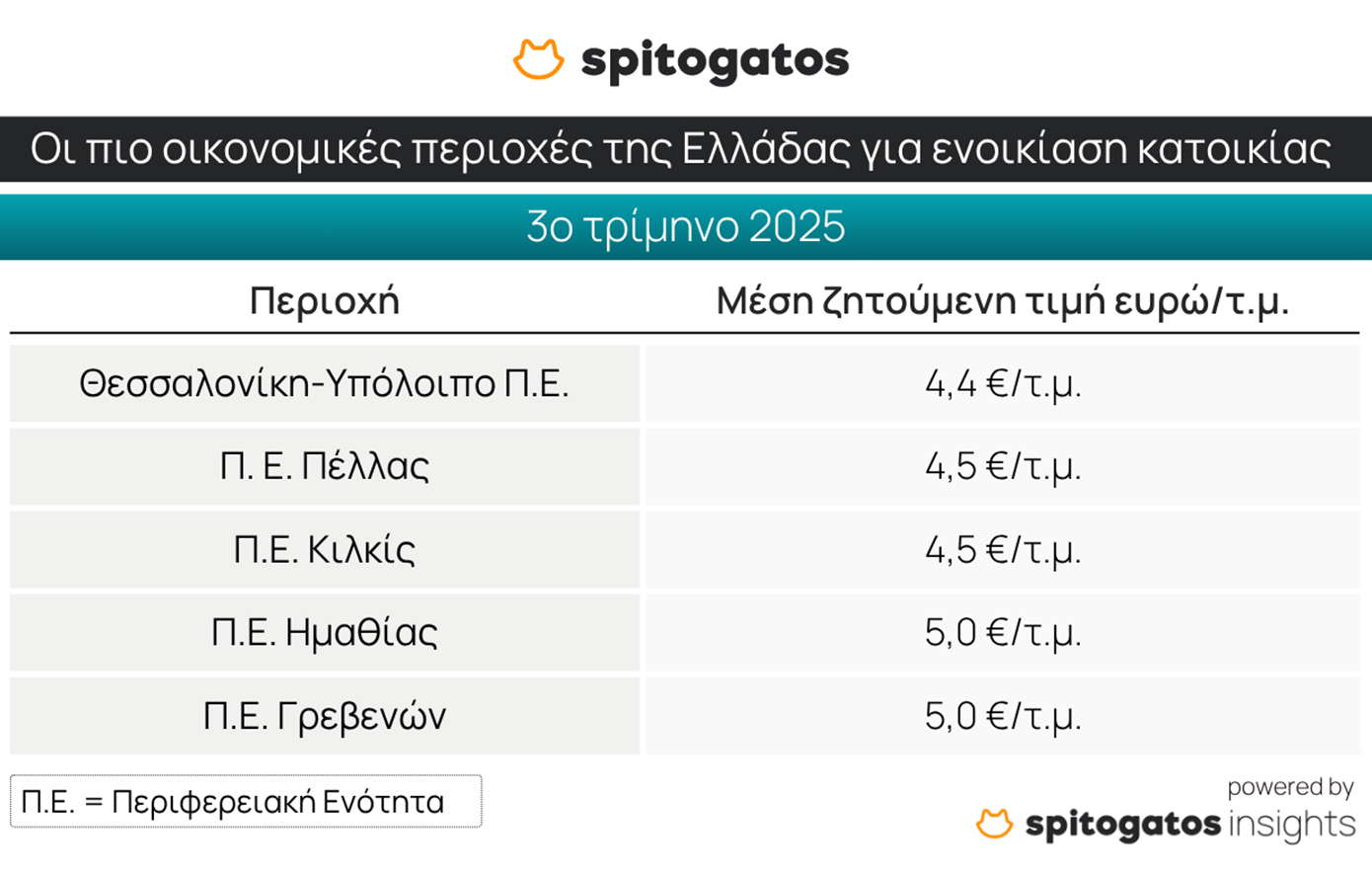 Στον αντίποδα, οι πιο οικονομικές επιλογές για αγορά κατοικίας καταγράφονται στις Π.Ε. Καστοριάς, Κοζάνης, Φλώρινας, Κιλκίς και Καρδίτσας. Στην πλευρά της ενοικίασης, οι χαμηλότερες τιμές παρατηρούνται στο υπόλοιπο της Π.Ε. Θεσσαλονίκης, καθώς και στις Π.Ε. Πέλλας, Κιλκίς, Ημαθίας και Γρεβενών.