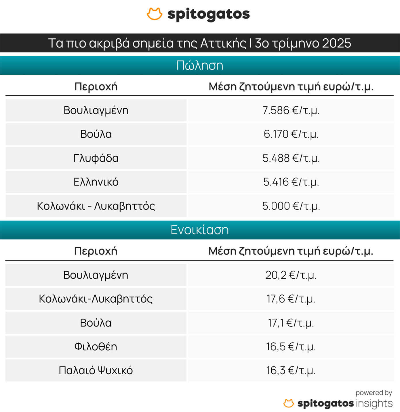 Οι υψηλότερες τιμές πώλησης παραμένουν σε περιοχές όπως η Βουλιαγμένη (7.586 ευρώ/τ.μ.), ενώ στο top 5 των πιο ακριβών περιοχών συγκαταλέγονται η Βούλα, η Γλυφάδα, το Ελληνικό και το Κολωνάκι–Λυκαβηττός (5.000 ευρώ/τ.μ.). Για την ενοικίαση, οι πιο ακριβές περιοχές είναι η Βουλιαγμένη, η Βούλα, το Κολωνάκι–Λυκαβηττός, η Φιλοθέη και το Παλαιό Ψυχικό, με ΜΖΤ 16,3 ευρώ/τ.μ.