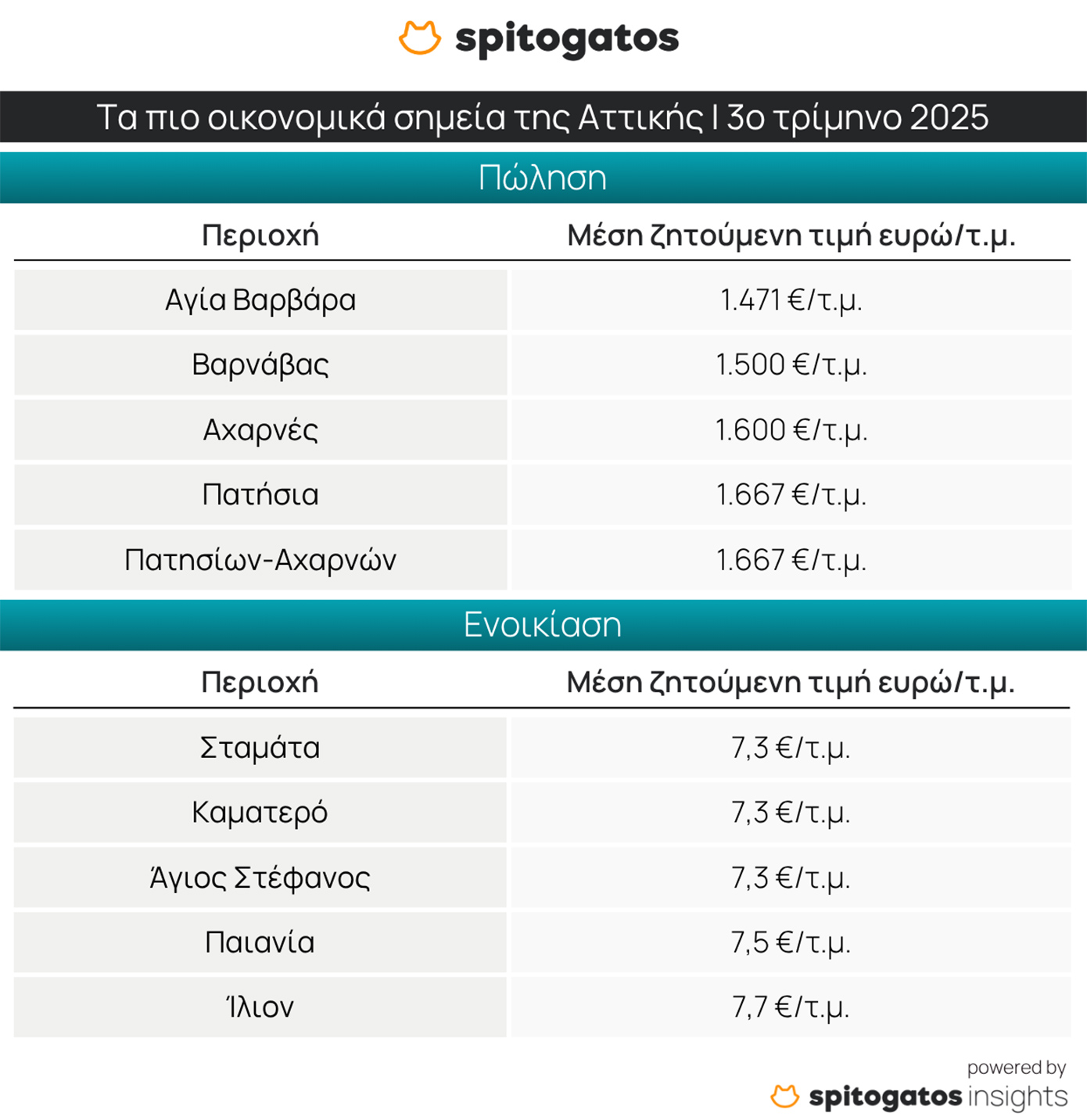 Στον αντίποδα, οι πιο οικονομικές επιλογές για αγορά κατοικίας στην Αττική περιλαμβάνουν την Αγία Βαρβάρα (1.471 ευρώ/τ.μ.), τον Βαρνάβα (1.500 ευρώ/τ.μ.), τις Αχαρνές (1.600 ευρώ/τ.μ.), την περιοχή Πατησίων–Αχαρνών και τα Πατήσια. Για ενοικίαση, οι χαμηλότερες ΜΖΤ καταγράφονται στη Σταμάτα (7,3 ευρώ/τ.μ.), το Καματερό (7,3 ευρώ/τ.μ.), τον Άγιο Στέφανο, την Παιανία και το Ίλιον.