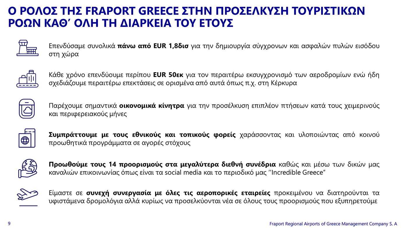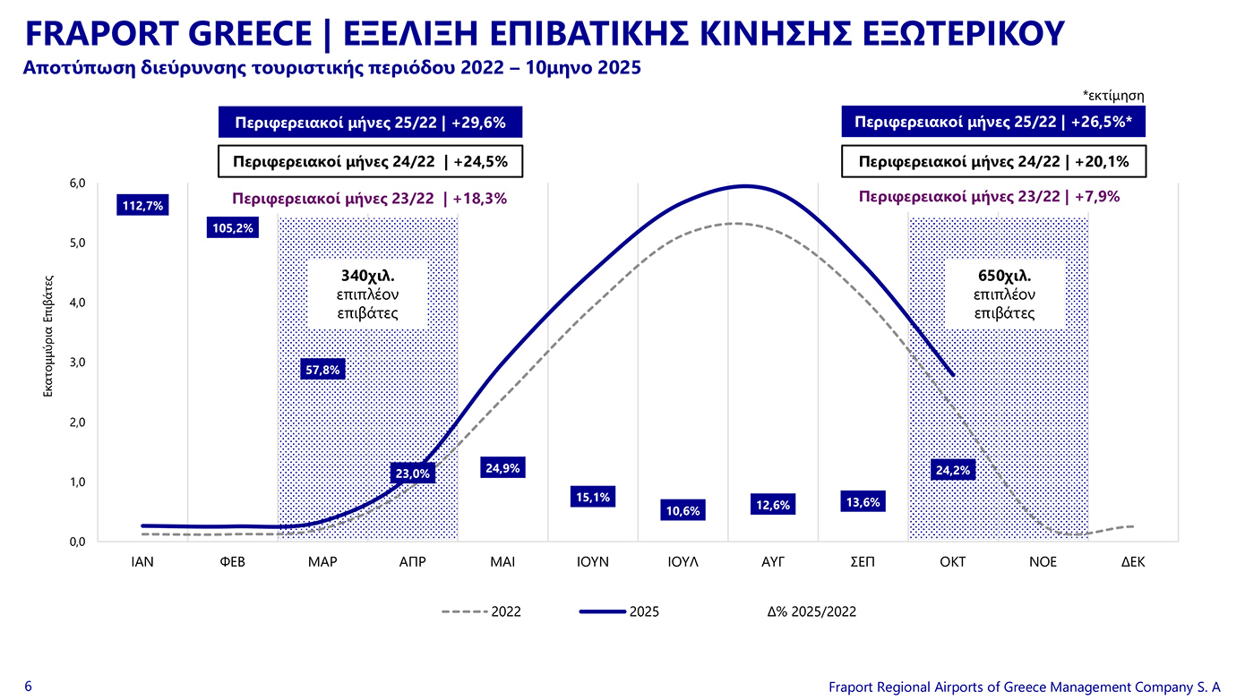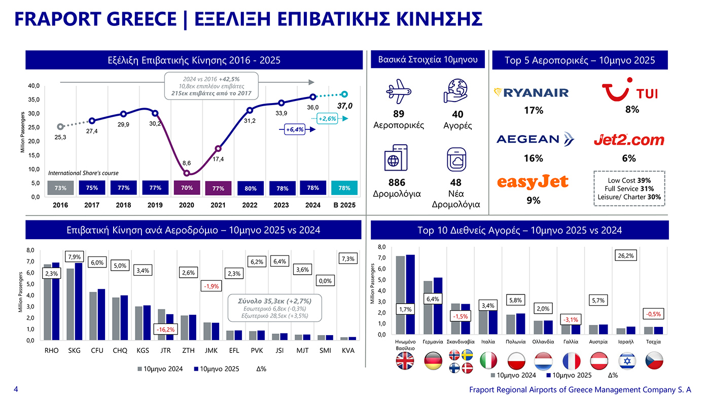 Από το 2016 – την τελευταία χρονιά πριν την παραχώρηση των αεροδρομίων – έως σήμερα, η συνολική επιβατική κίνηση έχει αυξηθεί κατά 45%, αντανακλώντας όχι μόνο τη δυναμική του ελληνικού τουρισμού αλλά και τις εκτεταμένες επενδύσεις που έχουν αλλάξει το πρόσωπο των αεροδρομίων.