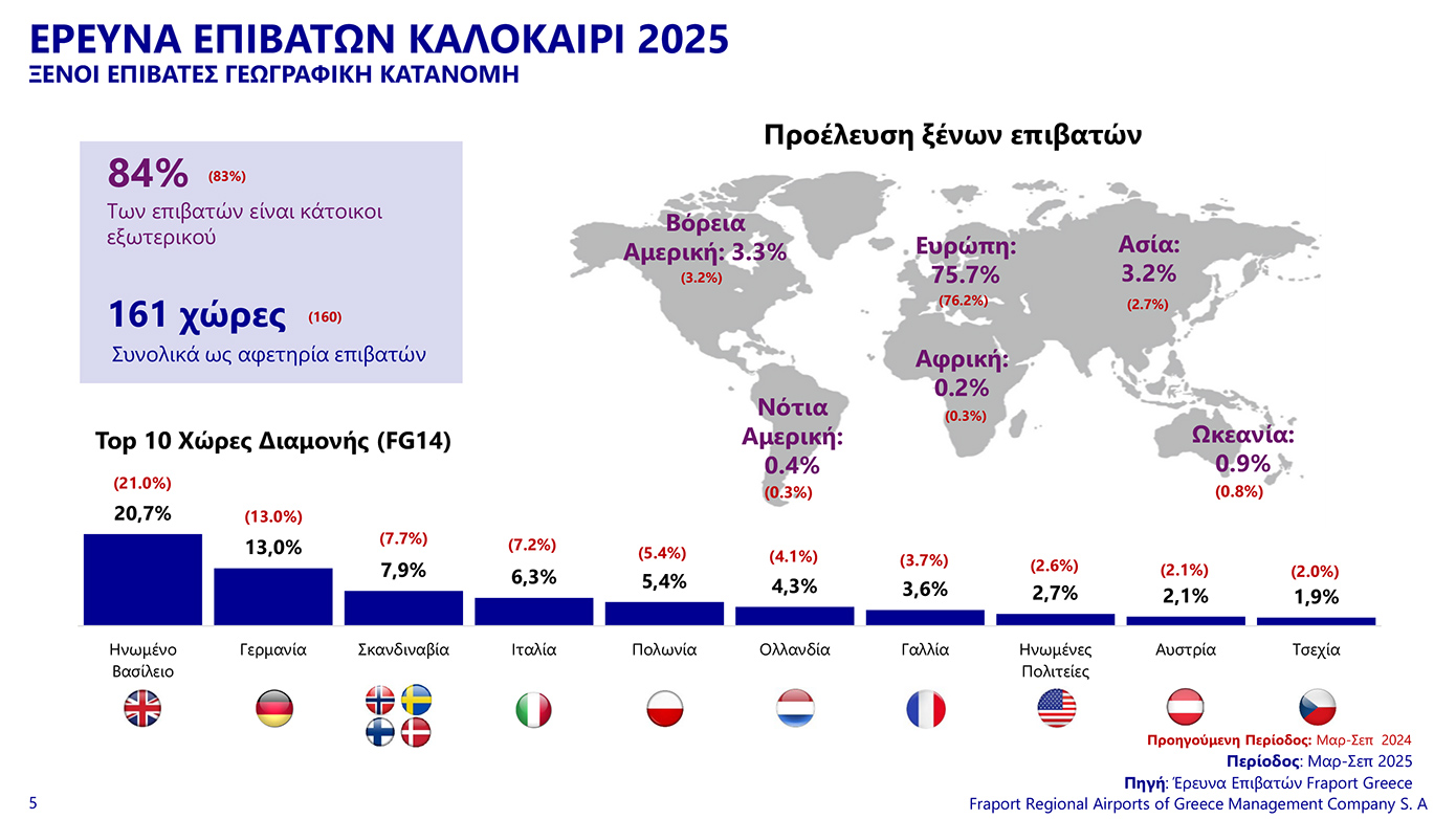 Κορυφαία αγορά είναι το Ηνωμένο Βασίλειο, ακολουθούμενο από Γερμανία και Σκανδιναβία, παρότι καταγράφηκε πίεση στους επιβάτες από την Σουηδία. Σημαντική άνοδο καταγράφουν και οι επισκέπτες από τις ΗΠΑ, που πλέον βρίσκονται στην 8η θέση με μερίδιο 2,7% ως πηγή επισκεπτών, παρά το γεγονός ότι δεν υπάρχουν απευθείας πτήσεις προς τα περιφερειακά αεροδρόμια και τροφοδοτική πηγή είναι ο Διεθνής Αερολιμένας Αθηνών.