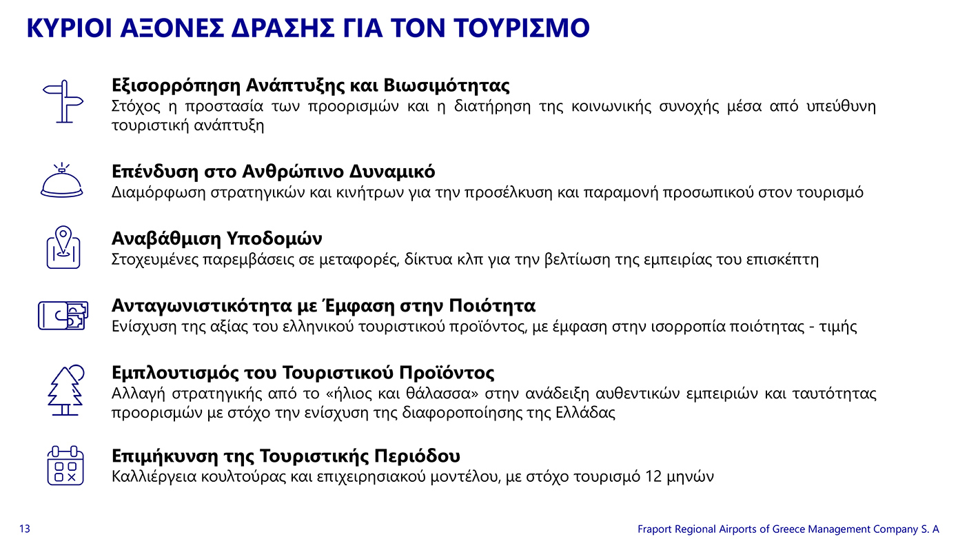 Η εταιρεία προχωρά σε νέο επενδυτικό κύκλο ύψους 200 εκατ. ευρώ, με στόχο την περαιτέρω ενίσχυση της χωρητικότητας και τη βελτίωση των υπηρεσιών στα αεροδρόμια. Μέχρι σήμερα, έχουν επενδυθεί συνολικά πάνω από 2 δισεκατομμύρια ευρώ για τον εκσυγχρονισμό των 14 περιφερειακών αεροδρομίων, εκ των οποίων περίπου 500 εκατομμύρια αφορούσαν τις αρχικές υποχρεωτικές επενδύσεις. Η εταιρεία δαπανά επιπλέον 50 εκατ. ευρώ κάθε χρόνο για συντήρηση και επιμέρους αναβαθμίσεις, ενώ στα ποσά αυτά δεν περιλαμβάνονται τα έργα των αεροδιαδρόμων που υλοποιούνται με χρηματοδότηση από το Ταμείο Ανάκαμψης.