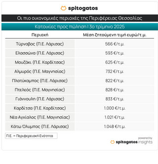 Η μεγαλύτερη ετήσια αύξηση στις ζητούμενες τιμές κατοικιών καταγράφηκε στην ΠΕ Καρδίτσας (+19,2%), ενώ άνοδο άνω του 10% παρουσίασε και η ΠΕ Μαγνησίας. Οι χαμηλότερες τιμές εξακολουθούν να παρατηρούνται σε Καρδίτσα και Τρίκαλα, ενώ οι υψηλότερες εντοπίζονται στις Σποράδες, όπου η μέση ζητούμενη τιμή φθάνει τα 2.632 ευρώ/τ.μ.