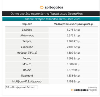 Τα νησιά των Σποράδων κυριαρχούν στο top 10 των πιο ακριβών περιοχών της Θεσσαλίας. Η Σκιάθος παραμένει η ακριβότερη, με μέση ζητούμενη τιμή 3.273 ευρώ/τ.μ., ενώ ακολουθούν Αλόννησος, Σκύρος, Σκόπελος και η περιοχή Μούρεσι στο Πήλιο (1.802 ευρώ/τ.μ.).