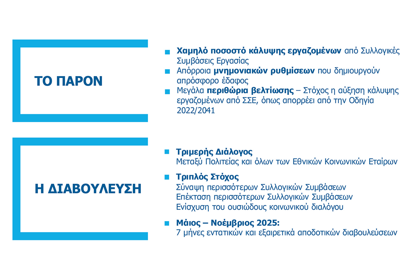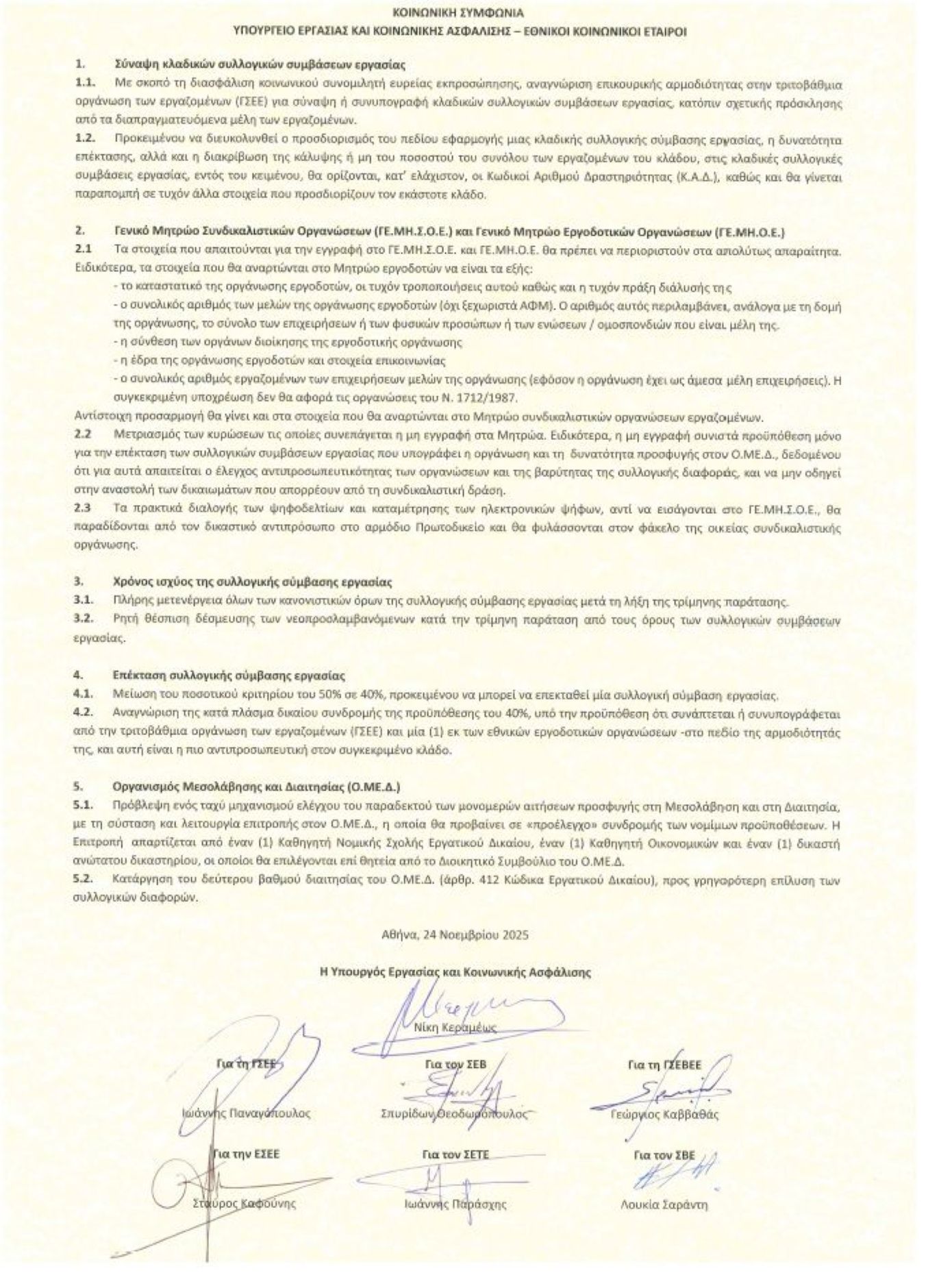 Η έκδοση του Σχεδίου Δράσης για την ενίσχυση των Συλλογικών Συμβάσεων Εργασίας θα πραγματοποιηθεί εντός του Δεκεμβρίου, ενώ η Κοινωνική Συμφωνία θα νομοθετηθεί στις αρχές του 2026.