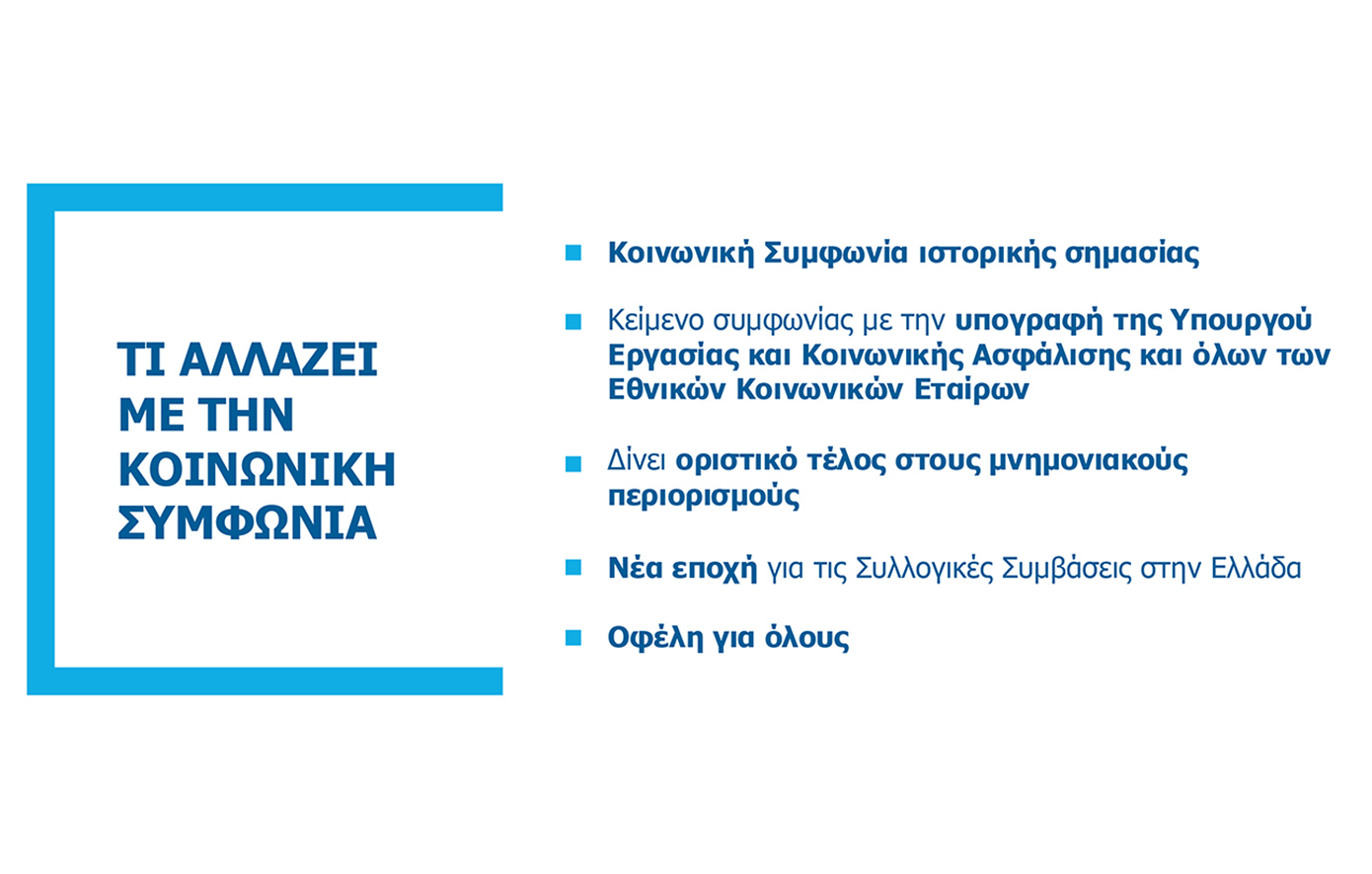 Η Κοινωνική Συμφωνία συνεπάγεται πολλαπλά οφέλη για εργαζόμενους και επιχειρήσεις καθώς οδηγεί στη σύναψη και επέκταση περισσότερων Συλλογικών Συμβάσεων Εργασίας, δημιουργεί ένα ασφαλές και προβλέψιμο εργασιακό περιβάλλον, προστατεύει πλήρως τα δικαιώματα των εργαζομένων ακόμα και μετά τη λήξη Συλλογικής Σύμβασης Εργασίας, προστατεύει τους νεοπροσλαμβανόμενους, δημιουργεί τις προϋποθέσεις για περαιτέρω αύξηση μισθών και παροχών, ενισχύει τον υγιή ανταγωνισμό και διασφαλίζει τη νομιμότητα με σαφή προσδιορισμό του πεδίου εφαρμογής των Συλλογικών Συμβάσεων Εργασίας και κατά την επέκτασή τους.