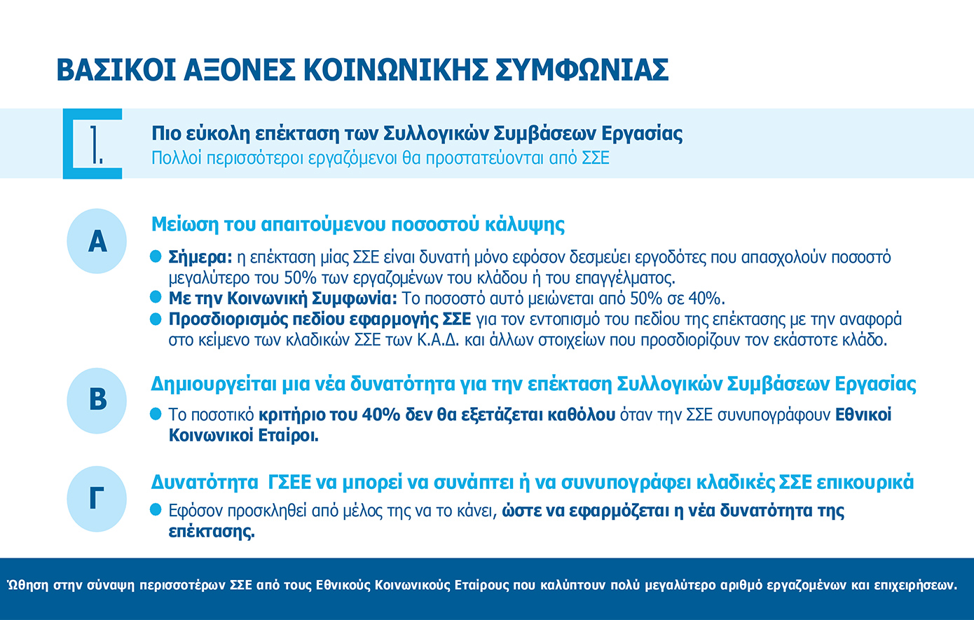 β) δημιουργείται νέα δυνατότητα για την επέκταση Συλλογικών Συμβάσεων Εργασίας, καθώς το ποσοτικό κριτήριο του 40% δεν θα εξετάζεται καθόλου όταν τη Συλλογική Σύμβαση Εργασίας συνυπογράφουν Εθνικοί Κοινωνικοί Εταίροι και