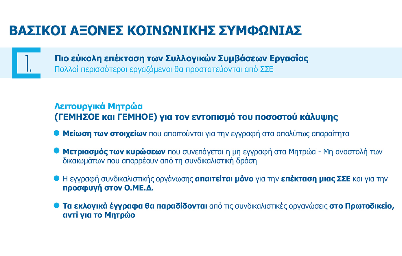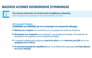 Ο πρώτος άξονας αφορά τη διευκόλυνση που παρέχεται στην επέκταση των Συλλογικών Συμβάσεων Εργασίας ώστε πολλοί περισσότεροι εργαζόμενοι να προστατεύονται από Συλλογικές Συμβάσεις Εργασίας. Στην κατεύθυνση αυτή: