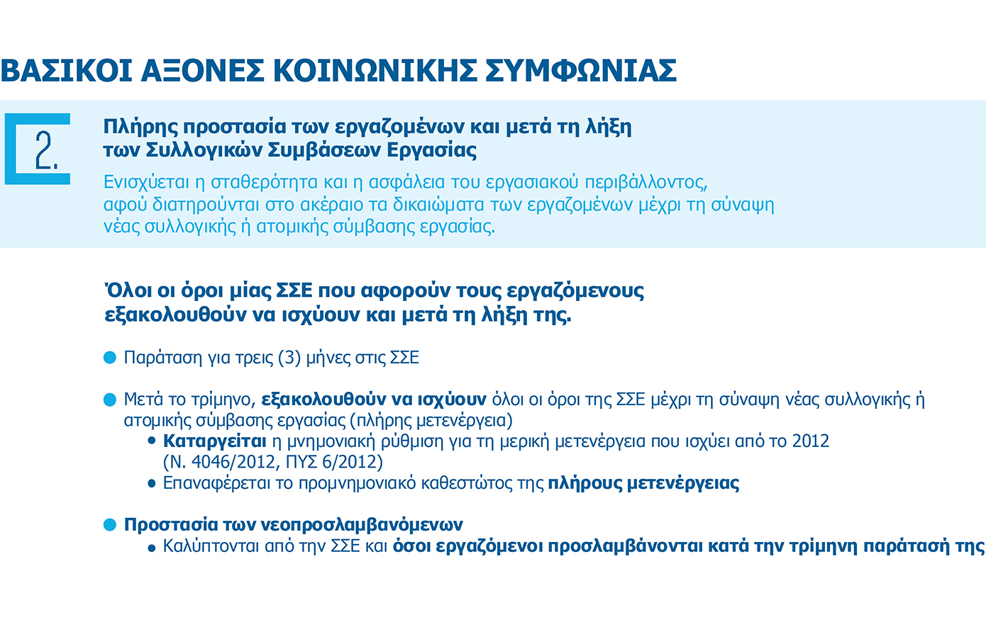 Ο δεύτερος άξονας αφορά στην πλήρη προστασία των εργαζομένων μετά τη λήξη των Συλλογικών Συμβάσεων Εργασίας. Με τον τρόπο αυτό ενισχύεται η σταθερότητα και η ασφάλεια του εργασιακού περιβάλλοντος, αφού διατηρούνται στο ακέραιο τα δικαιώματα των εργαζομένων μέχρι τη σύναψη νέας συλλογικής ή ατομικής σύμβασης εργασίας. Στην κατεύθυνση αυτή, όλοι οι όροι μιας Συλλογικής Σύμβασης Εργασίας εξακολουθούν να ισχύουν και μετά τη λήξη της. Αρχικά, δίνεται μία παράταση τριών μηνών στην ισχύ της. Μετά την παρέλευση αυτού του χρόνου εξακολουθούν να ισχύουν όλοι οι όροι της Συλλογικής Σύμβασης Εργασίας, μέχρι τη σύναψη νέας συλλογικής ή ατομικής σύμβασης εργασίας. Καταργείται η μνημονιακή ρύθμιση για τη μερική μετενέργεια που ισχύει από το 2012 και επαναφέρεται το προμνημονιακό καθεστώς της πλήρους μετενέργειας. Επίσης, καλύπτονται από τη Συλλογική Σύμβαση Εργασίας και όσοι εργαζόμενοι προσλαμβάνονται κατά την τρίμηνη παράτασή της.