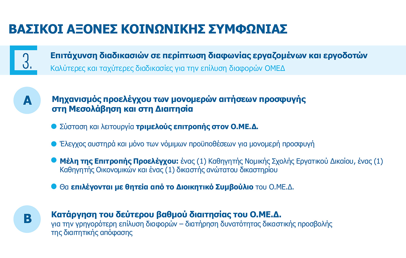 Ο τρίτος άξονας αφορά στην επιτάχυνση των διαδικασιών σε περίπτωση διαφωνίας εργαζομένων και εργοδοτών. Θεσπίζονται καλύτερες και ταχύτερες διαδικασίες για την επίλυση διαφορών μέσω του Ο.ΜΕ.Δ. Συγκεκριμένα, η Κοινωνική Συμφωνία προβλέπει μηχανισμό προελέγχου των προϋποθέσεων για μονομερή προσφυγή στη Μεσολάβηση και στη Διαιτησία από τριμελή επιτροπή που θα συσταθεί στον Ο.ΜΕ.Δ. Επίσης, καταργείται ο δεύτερος βαθμός διαιτησίας του Ο.ΜΕ.Δ για τη γρηγορότερη επίλυση διαφορών, ενώ διατηρείται η δυνατότητα δικαστικής προσβολής της διαιτητικής απόφασης.
