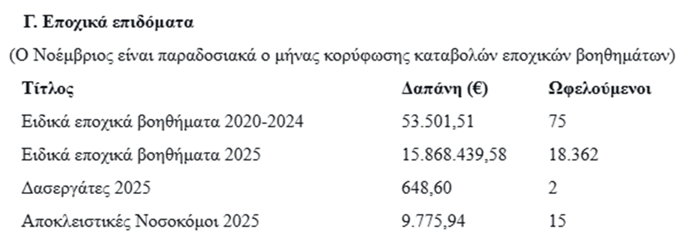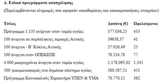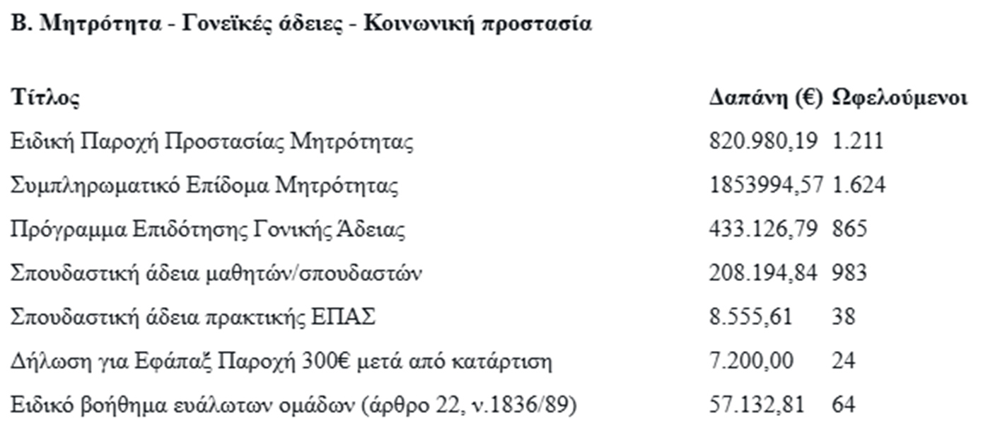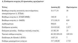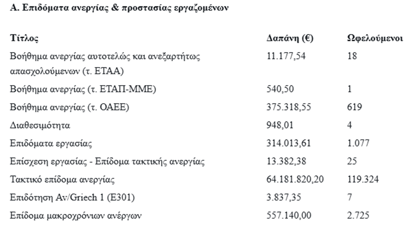 Ακολουθούν πίνακες, όπου παρουσιάζονται αναλυτικά οι συνολικές δαπάνες και ο αριθμός ωφελουμένων, οργανωμένες σε τέσσερις βασικές κατηγορίες.