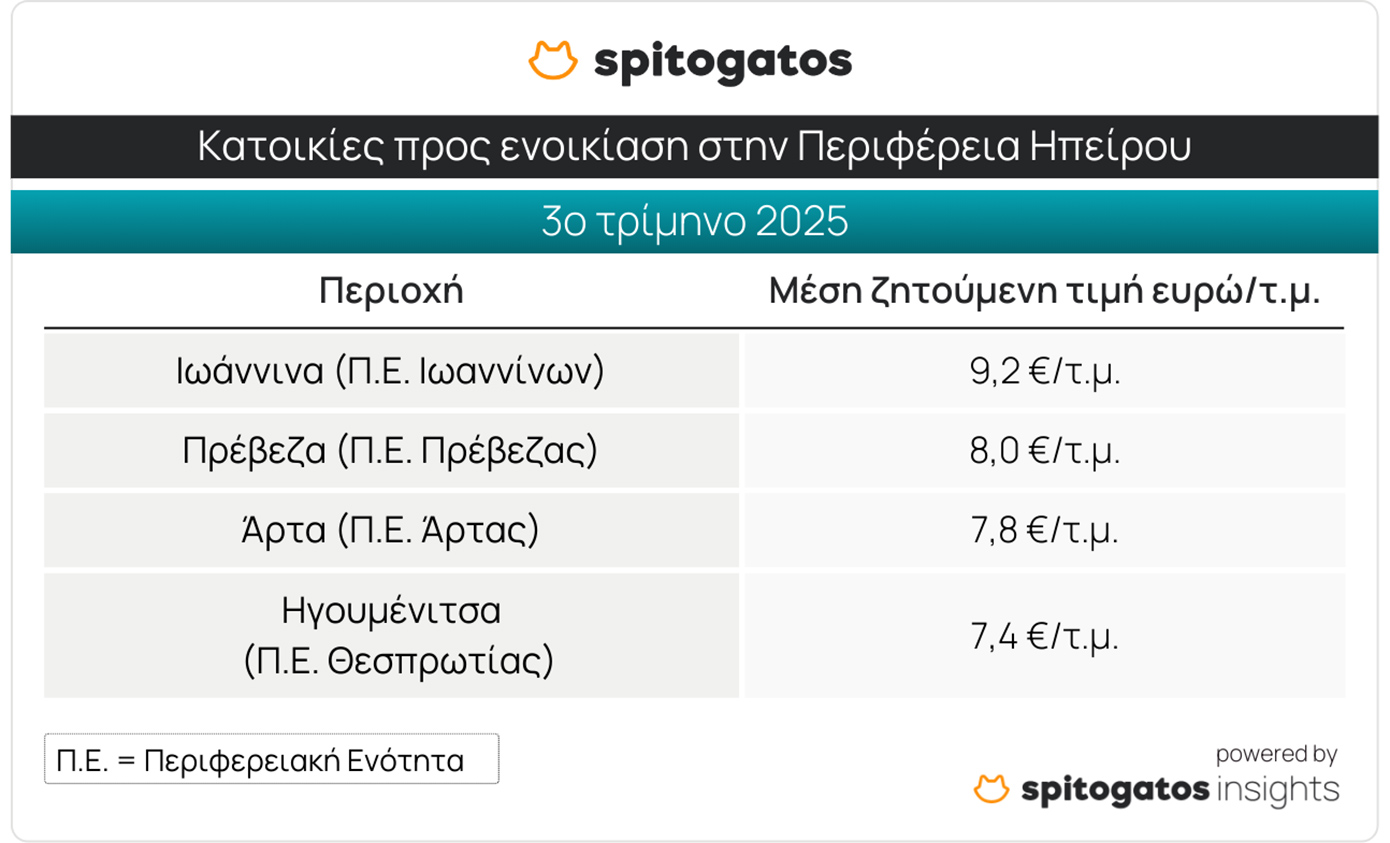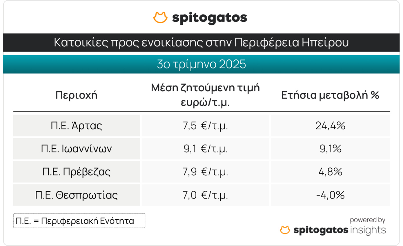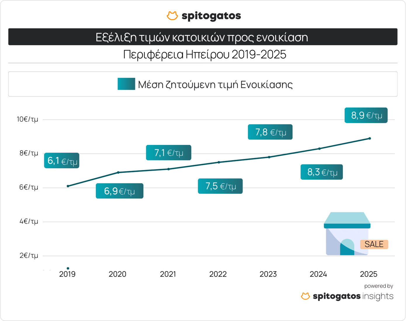 Την περίοδο 2019–2025, η μέση ζητούμενη τιμή πώλησης κατοικιών στην Ήπειρο έχει ενισχυθεί κατά 41%, ενώ το 2025 η αύξηση σε σχέση με το 2024 φτάνει το 7,3%. Στις ενοικιάσεις, η άνοδος από το 2019 έως σήμερα είναι ακόμα μεγαλύτερη, φτάνοντας το 47,2%. Η μέση ζητούμενη τιμή ενοικίασης φτάνει πλέον τα 8,9 ευρώ/τ.μ., αυξημένη κατά 7,1% σε ετήσια βάση.