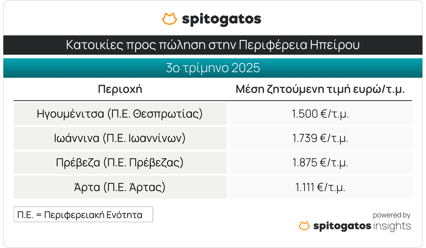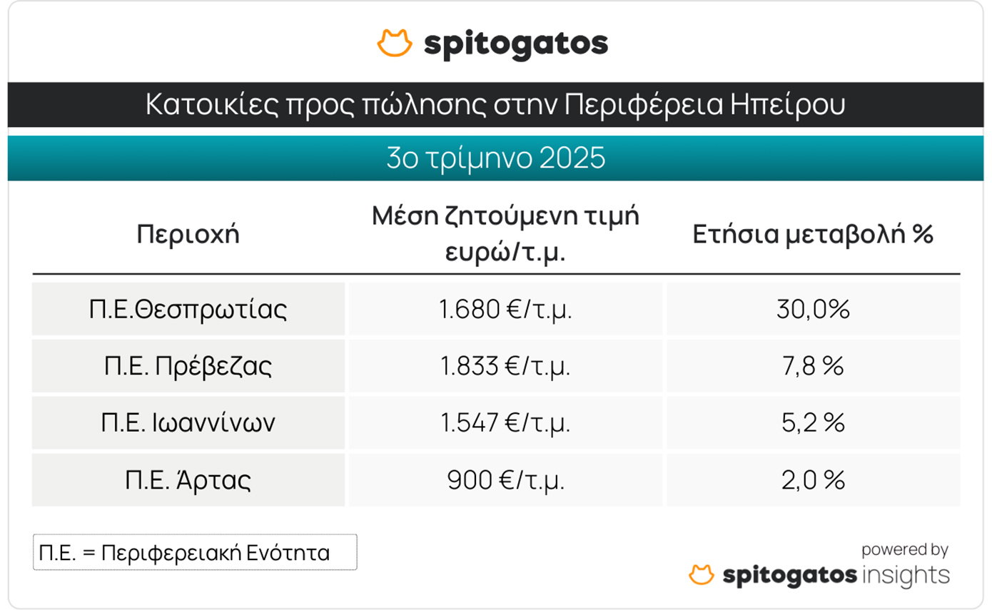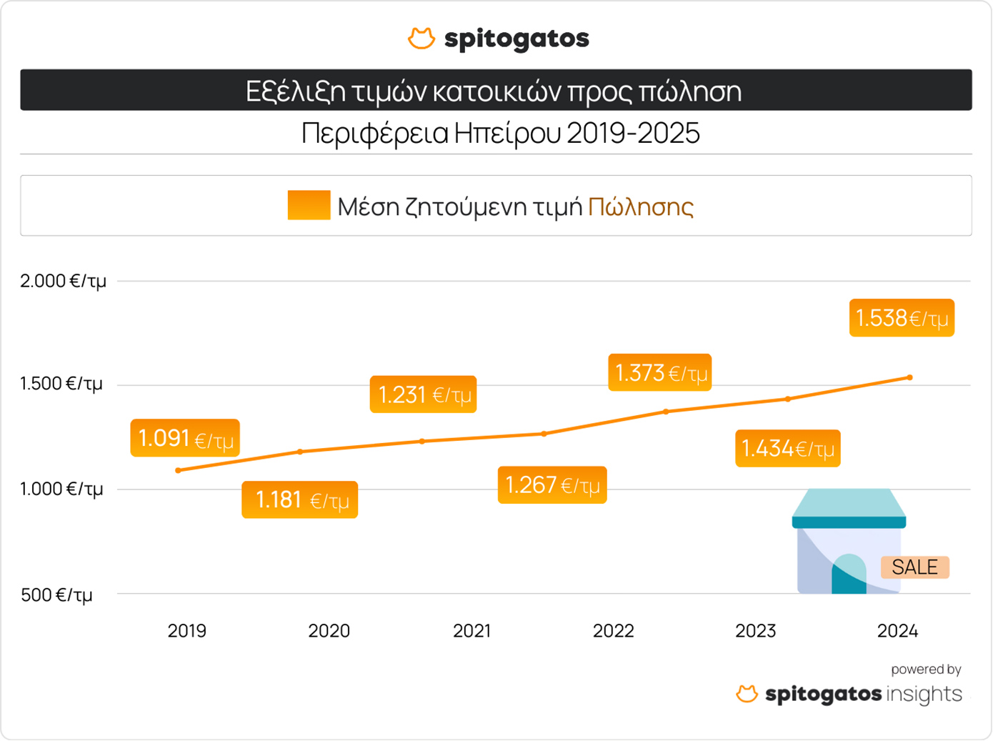 Την περίοδο 2019–2025, η μέση ζητούμενη τιμή πώλησης κατοικιών στην Ήπειρο έχει ενισχυθεί κατά 41%, ενώ το 2025 η αύξηση σε σχέση με το 2024 φτάνει το 7,3%. Στις ενοικιάσεις, η άνοδος από το 2019 έως σήμερα είναι ακόμα μεγαλύτερη, φτάνοντας το 47,2%. Η μέση ζητούμενη τιμή ενοικίασης φτάνει πλέον τα 8,9 ευρώ/τ.μ., αυξημένη κατά 7,1% σε ετήσια βάση.